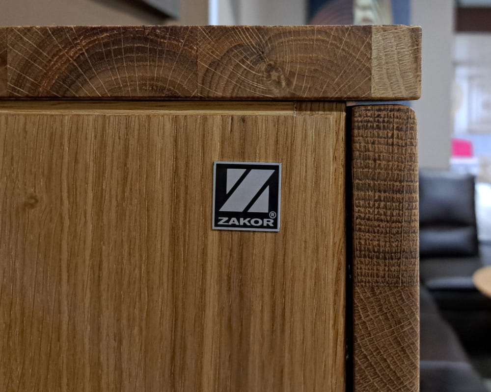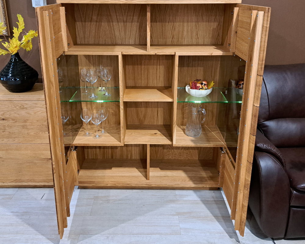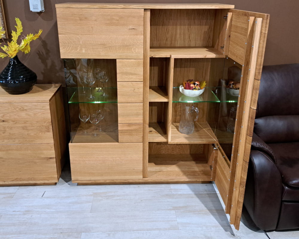 - Wykończenie: lite drewno dębowe (olejowane, natura) / szkło