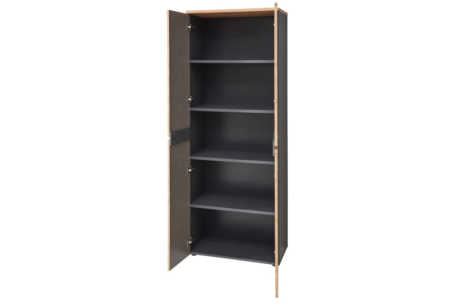Szafa wyposażona jest w drzwi uchylne, które mogą otwierać się w lewą lub prawą stronę, co umożliwia dopasowanie mebla do układu pomieszczenia oraz indywidualnych potrzeb użytkownika. Frezowanie w miejscu uchwytu zapewnia wygodny i pewny chwyt, jednocześnie zachowując prostą, nowoczesną formę bryły.