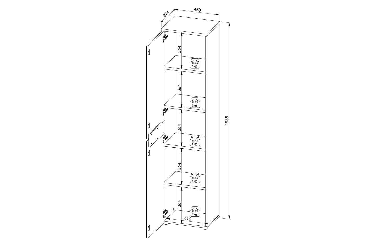 Szafa Brego to kompaktowy i funkcjonalny mebel zaprojektowany z myślą o efektywnym wykorzystaniu przestrzeni. Smukła, wysoka bryła sprawia, że szafa dobrze sprawdza się w miejscach, gdzie liczy się oszczędność miejsca. Przy szerokości 45 cm i głębokości 38 cm łatwo wpasowuje się w wąskie wnęki lub mniejsze pomieszczenia, a wysokość 197 cm pozwala w pełni wykorzystać przestrzeń w pionie. Pełne, uchylne fronty estetycznie zasłaniają zawartość szafy, pomagając utrzymać porządek i spójny wygląd wnętrza.