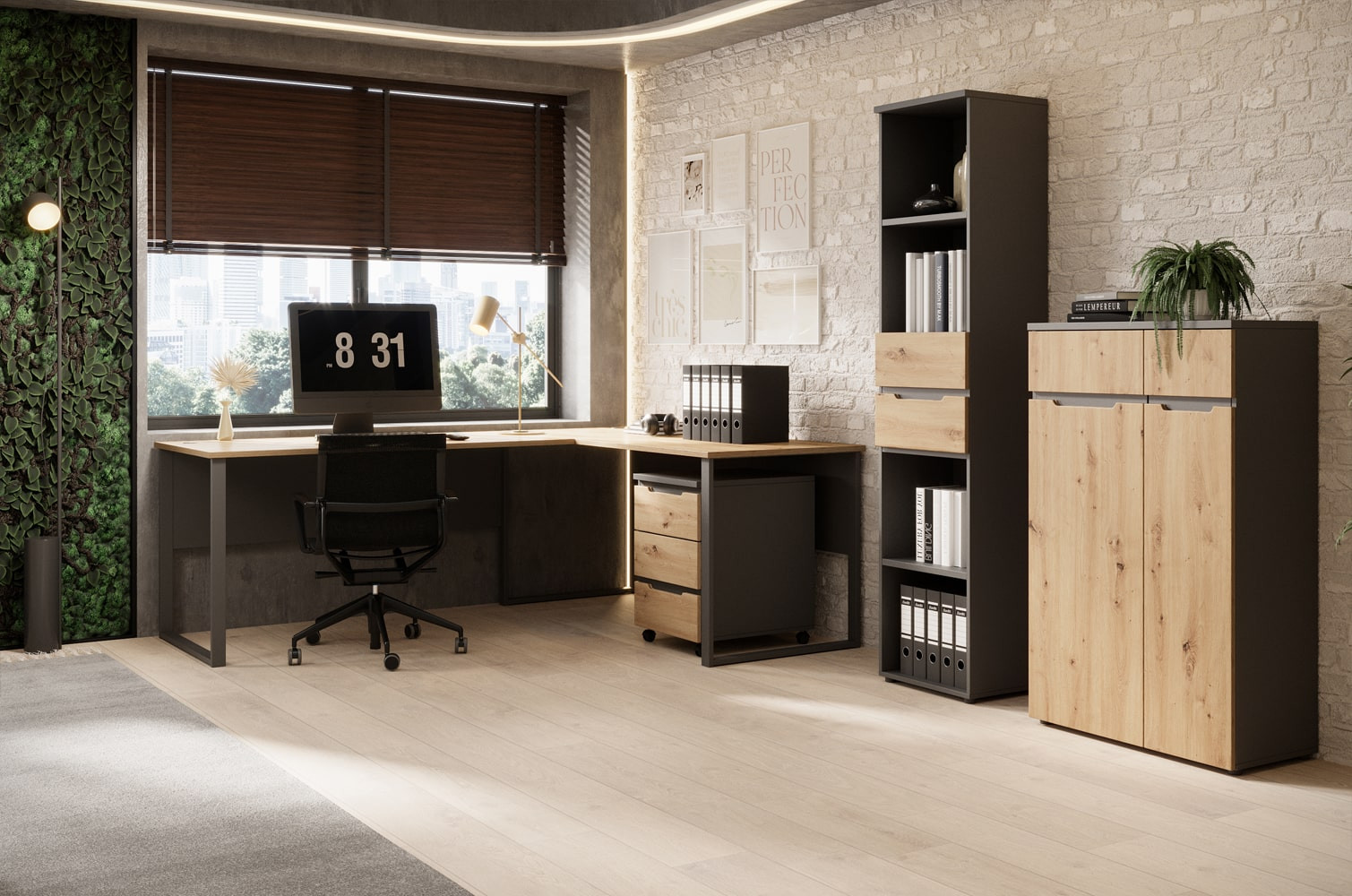 Wnętrze regału zostało podzielone na dwie półki oraz dwie praktyczne szuflady, co umożliwia wygodną organizację różnych przedmiotów. Otwarta część świetnie sprawdza się do ekspozycji książek, albumów lub dekoracji, natomiast szuflady pozwalają przechowywać drobne akcesoria i rzeczy codziennego użytku poza zasięgiem wzroku. Pełne fronty szuflad nadają bryle uporządkowany wygląd, a subtelne wcięcia pełnią funkcję uchwytów, ułatwiając ich wygodne otwieranie.