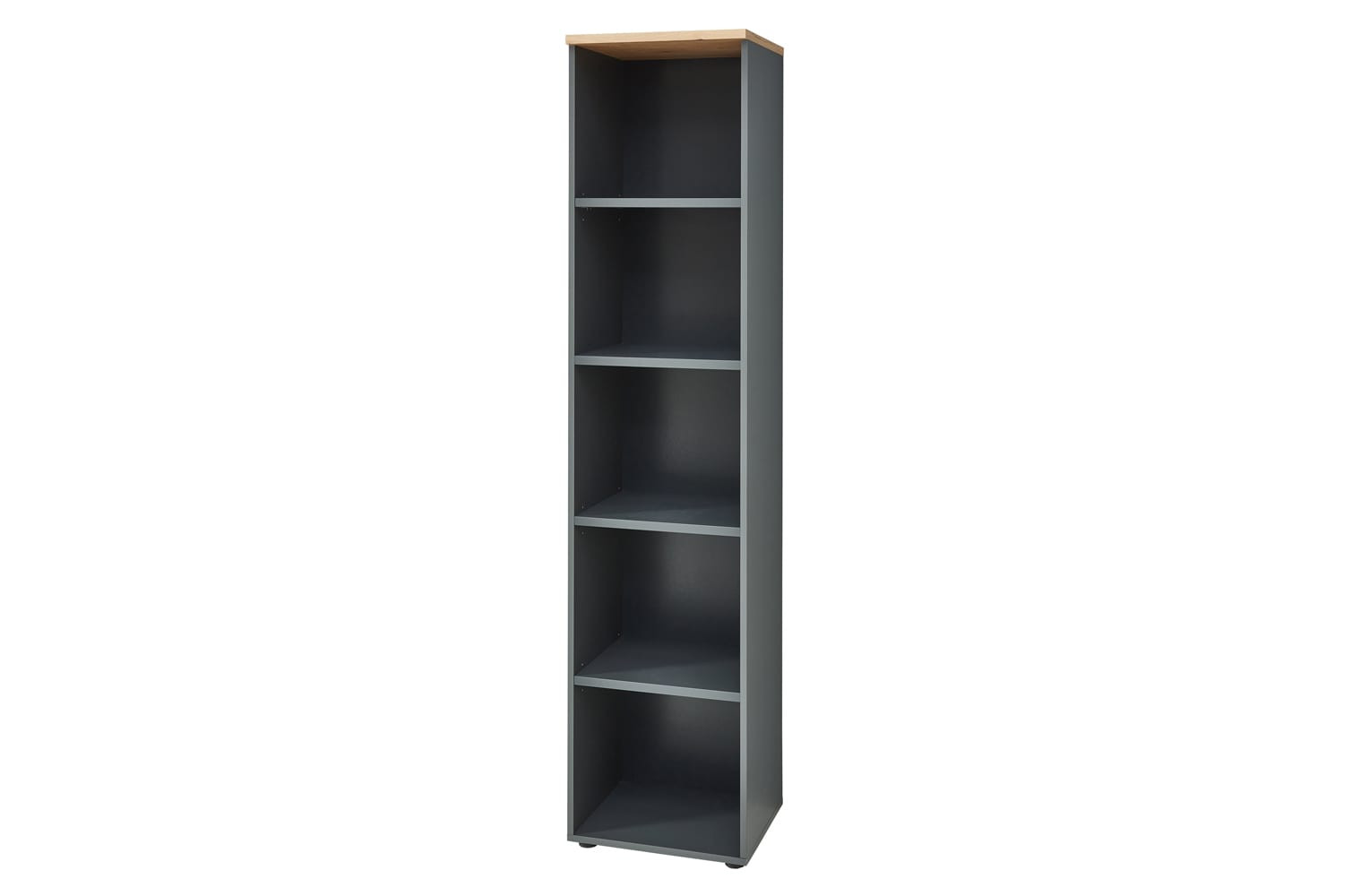 Wnętrze regału tworzą cztery równomiernie rozmieszczone półki, które umożliwiają wygodne uporządkowanie różnych przedmiotów. To praktyczne miejsce na książki, dokumenty, pudełka z akcesoriami czy dekoracje. Przejrzysty układ półek ułatwia codzienne odkładanie rzeczy oraz szybkie odnalezienie potrzebnych przedmiotów.