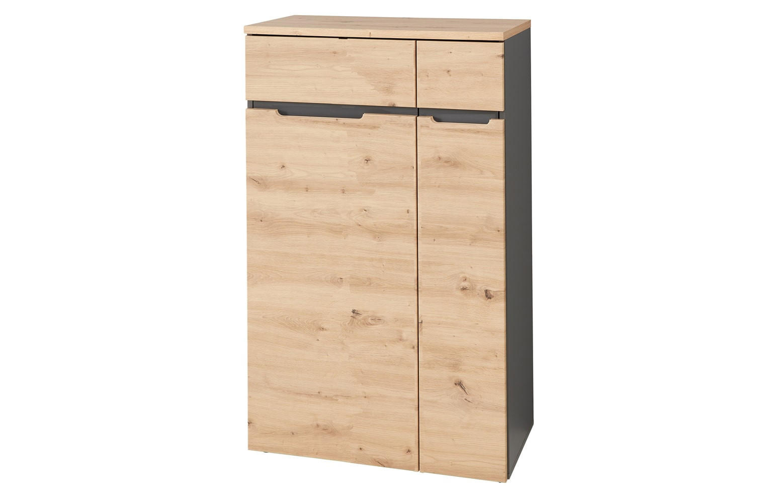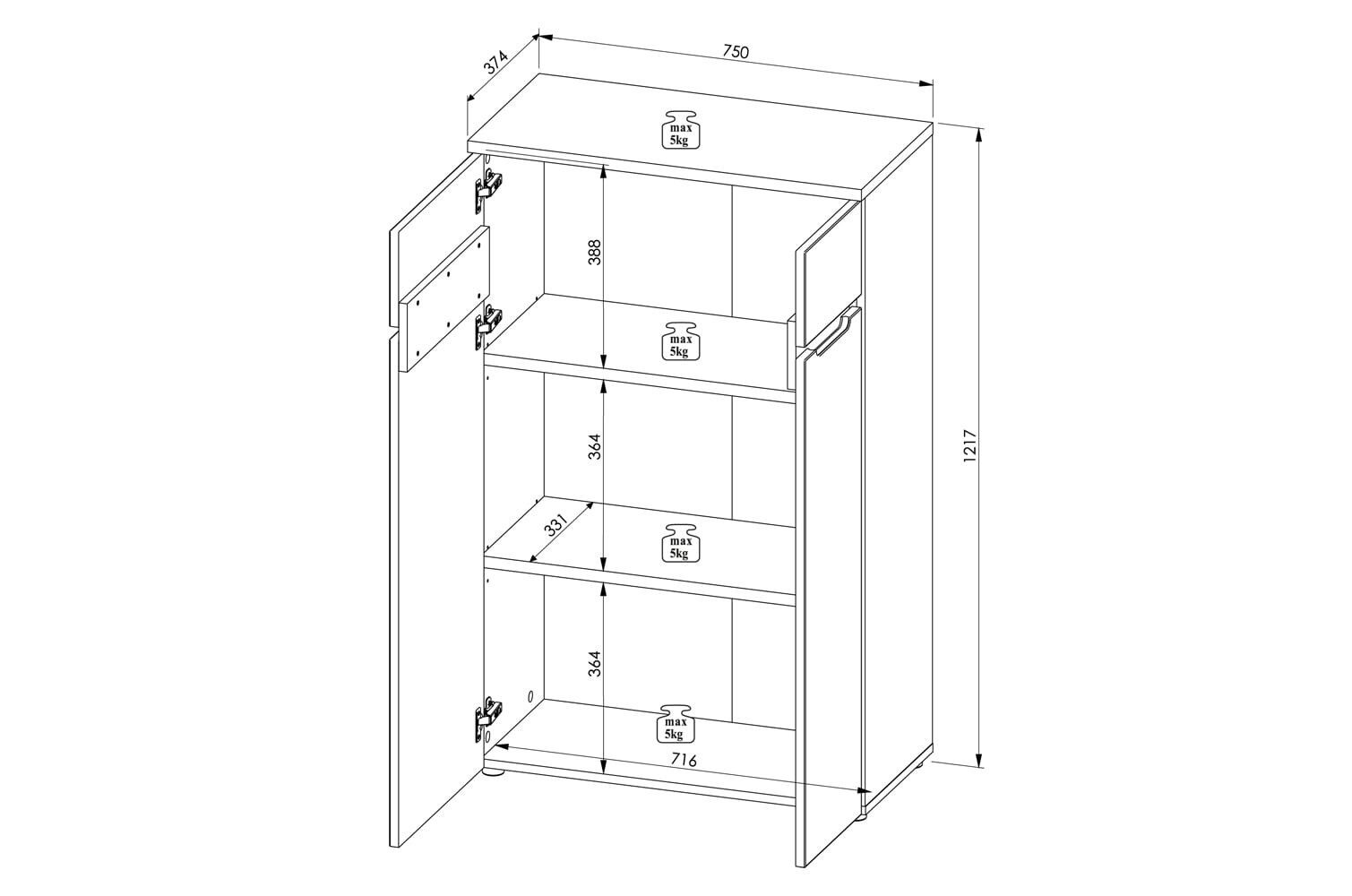 Przemyślane wymiary sprawiają, że komoda dobrze sprawdza się również w mniejszych przestrzeniach. Szerokość 75 cm i głębokość 38 cm pozwalają ustawić mebel w węższych wnękach lub ciągach komunikacyjnych, natomiast wysokość 122 cm zapewnia dodatkową pojemność w pionie bez zajmowania dużej powierzchni podłogi. Dzięki temu komoda może stanowić funkcjonalny element wyposażenia zarówno w salonie, sypialni, jak i w przedpokoju.