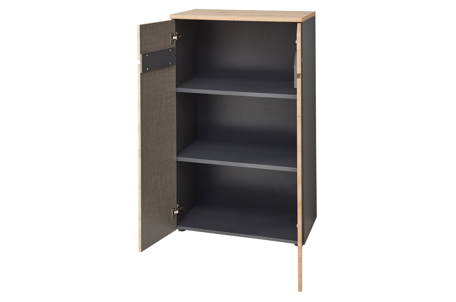 Wnętrze komody zostało wyposażone w trzy półki, które umożliwiają wygodne uporządkowanie różnych rzeczy według potrzeb. Taki układ sprzyja przechowywaniu odzieży, tekstyliów, dokumentów czy akcesoriów, a podział na poziomy pomaga utrzymać porządek i ułatwia szybkie odnalezienie potrzebnych przedmiotów.