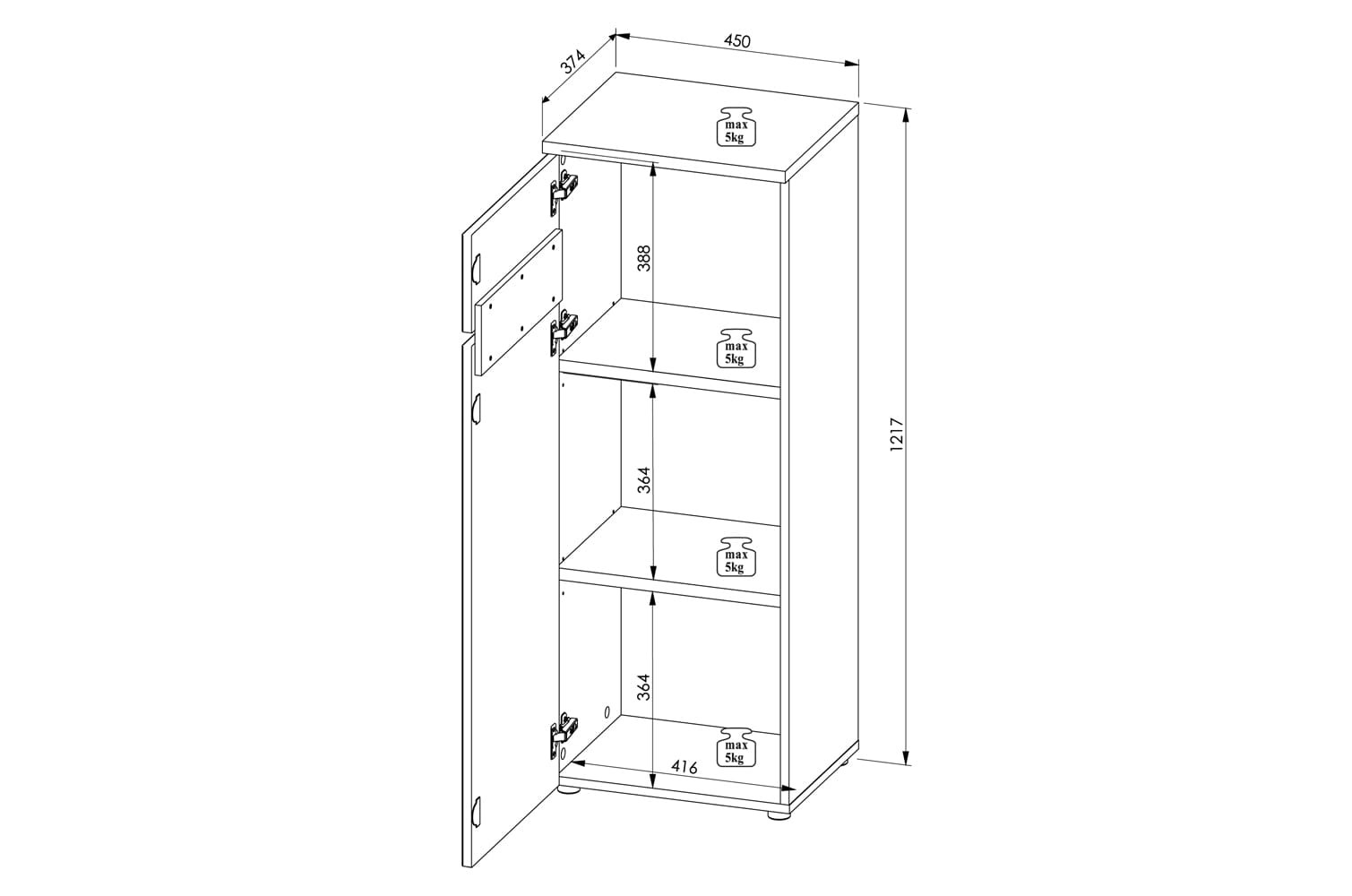 Kompaktowe wymiary 45 cm szerokości, 122 cm wysokości i 38 cm głębokości pozwalają ustawić szafkę w wąskich miejscach, wnękach lub ciągach komunikacyjnych. Smukła konstrukcja sprawia, że mebel zajmuje niewiele miejsca, a jednocześnie oferuje praktyczną przestrzeń do przechowywania. Podparcie na nodze nadaje bryle lekkości wizualnej i ułatwia utrzymanie czystości pod meblem.