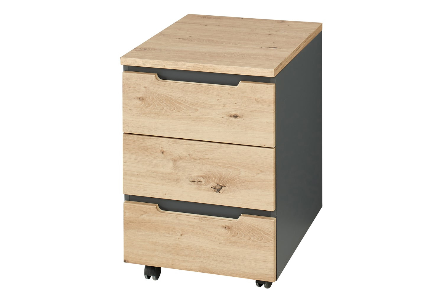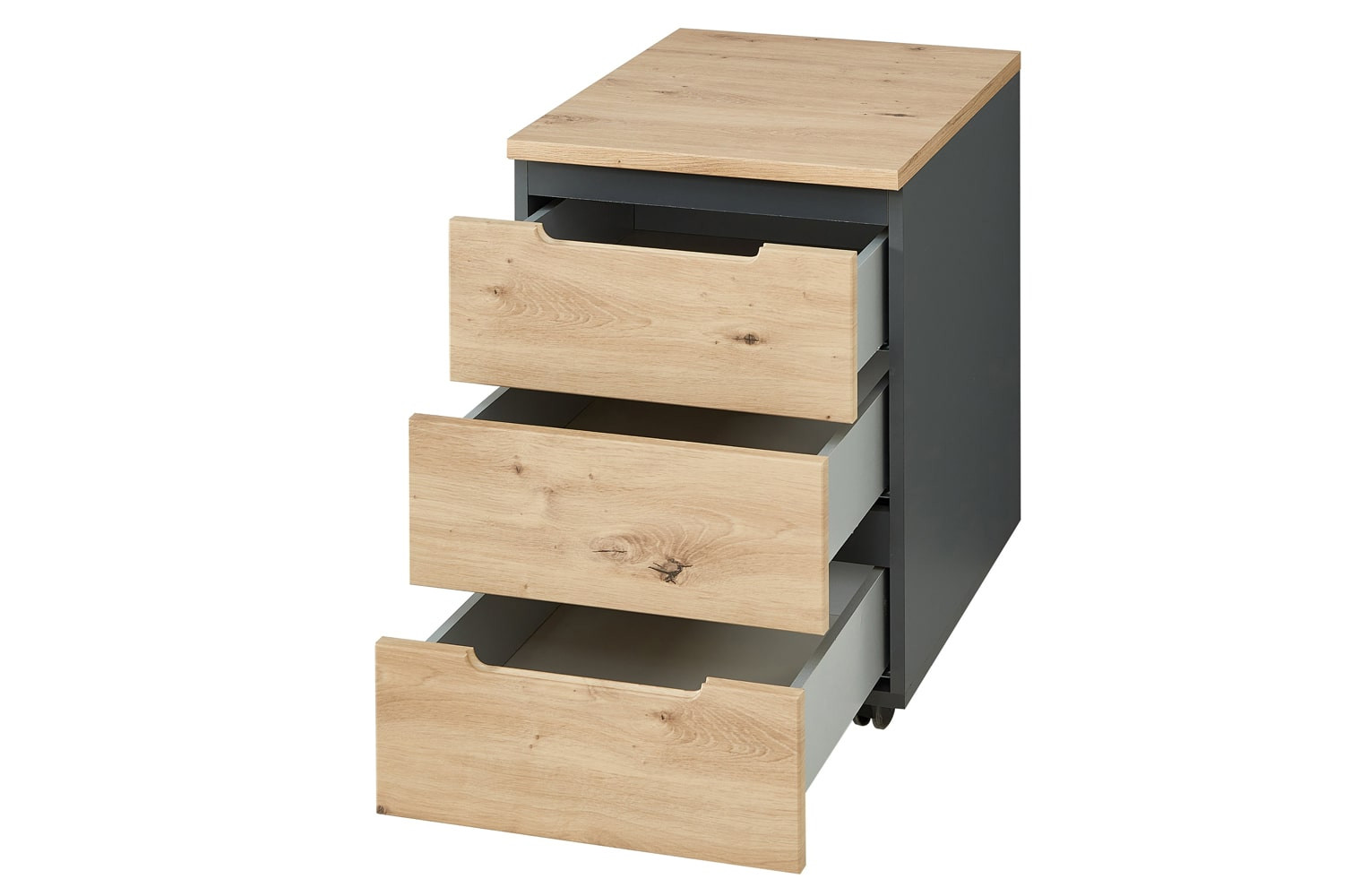 Szafka została wyposażona w trzy wysuwane szuflady, które pozwalają wygodnie uporządkować dokumenty, akcesoria biurowe oraz drobne przedmioty codziennego użytku. Taki podział przestrzeni ułatwia zachowanie porządku i szybkie odnajdywanie potrzebnych rzeczy. Fronty z wygodnymi uchwytami zapewniają sprawne i komfortowe otwieranie, a prostokątny blat może służyć jako dodatkowa powierzchnia do odkładania notatników, organizerów czy innych podręcznych akcesoriów.