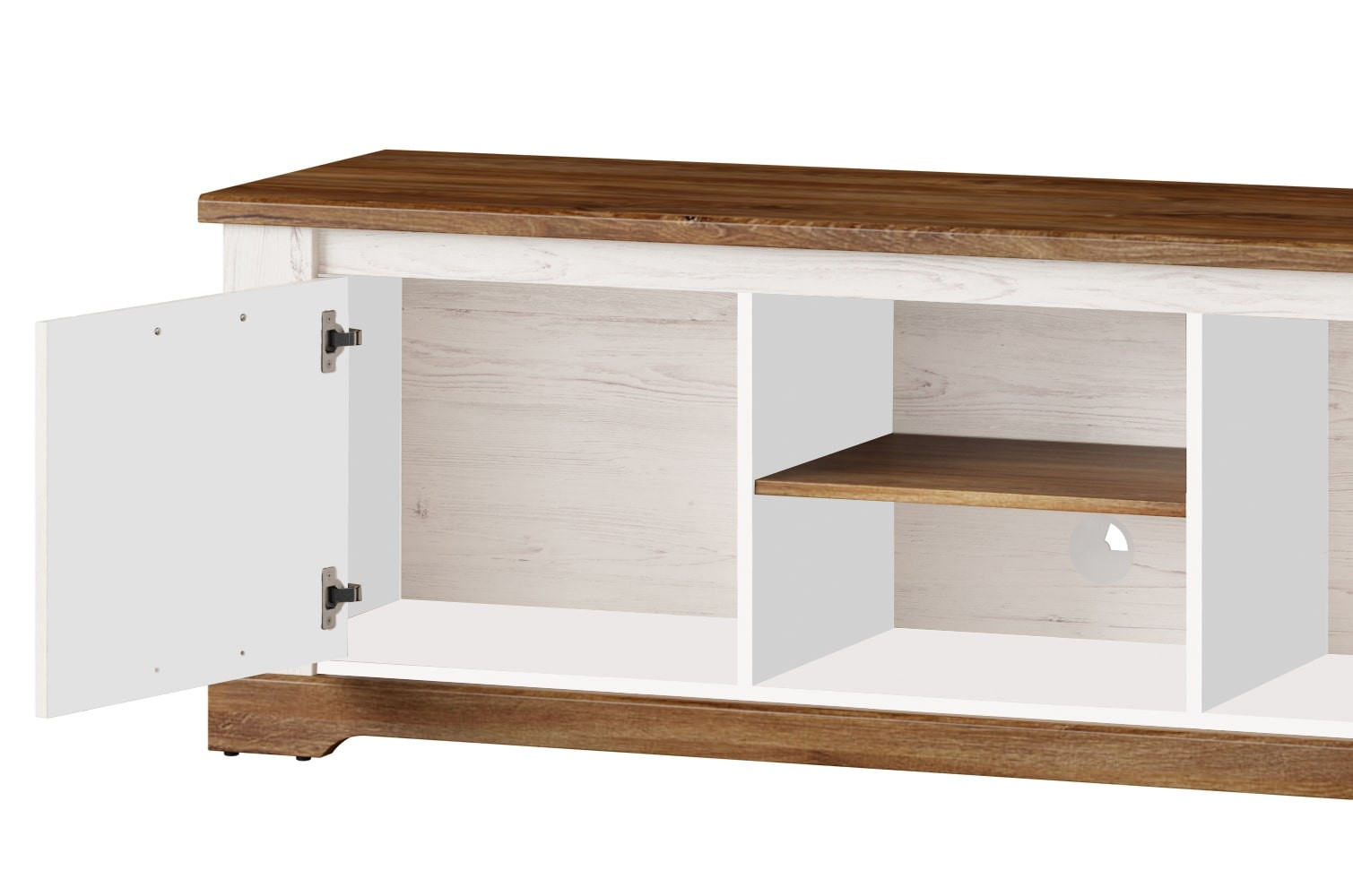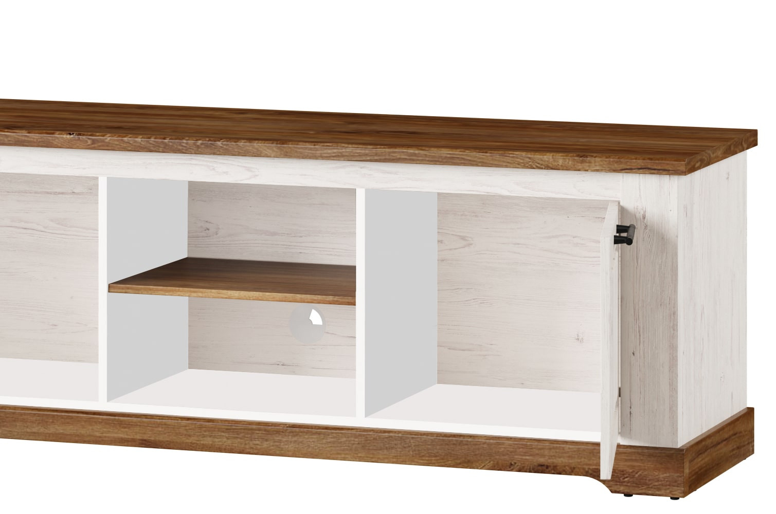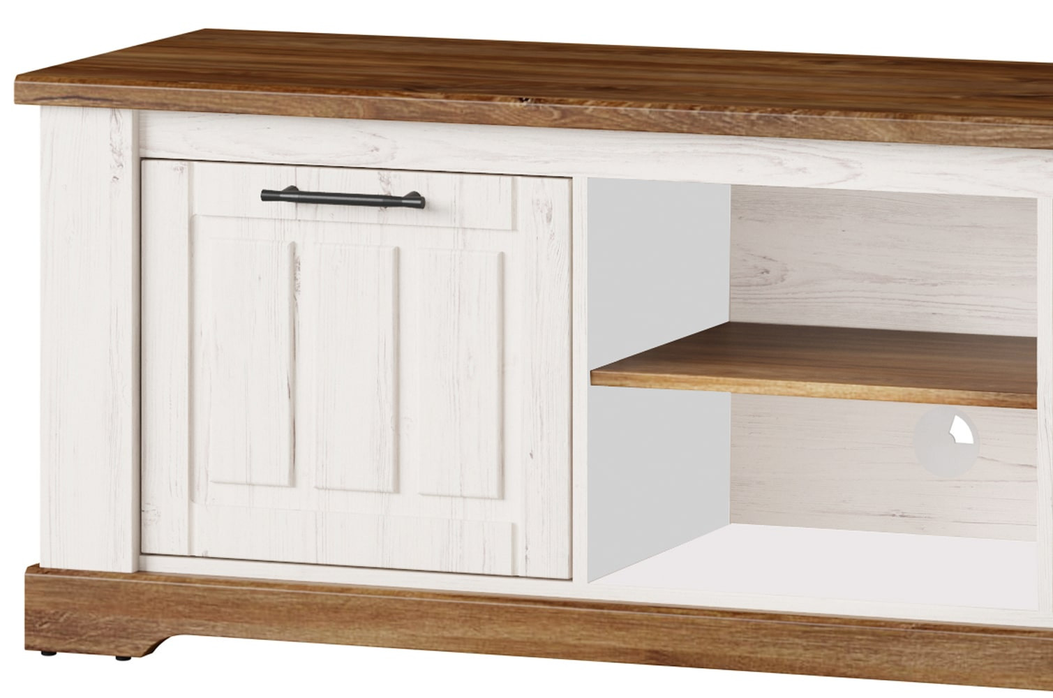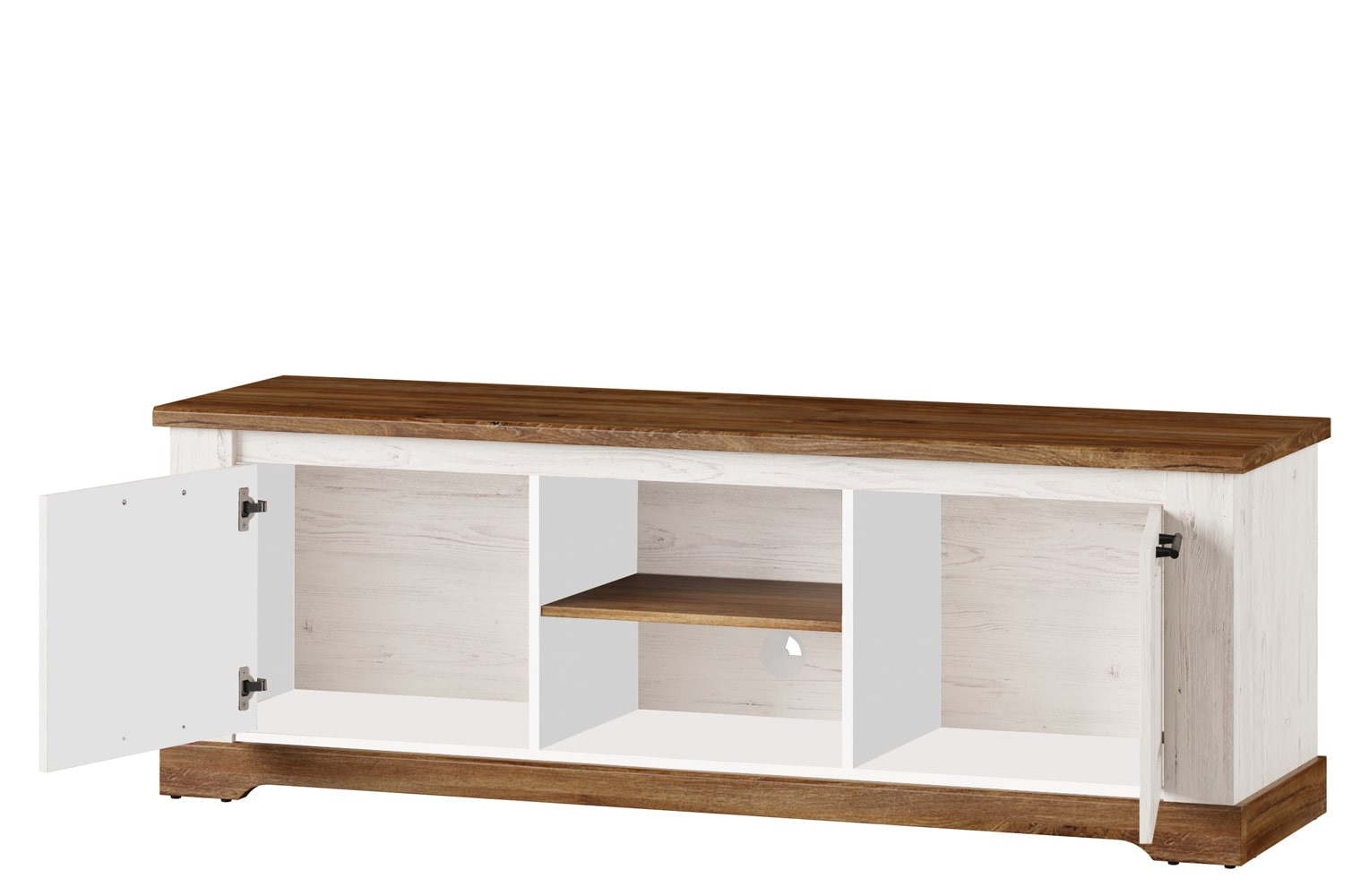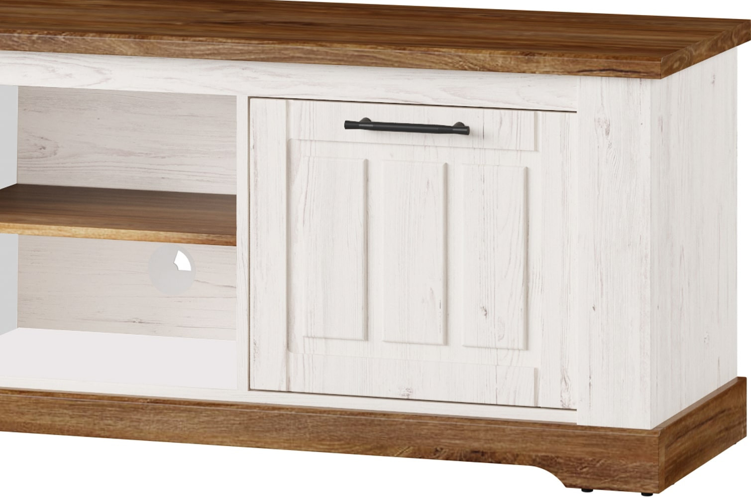 Niska szafka RTV w nietypowym wydaniu kolekcji Country. Jeśli marzysz o wnętrzu w stylu prowansalskim, jeśli lubisz klasyczne bryły i zdobienia to ta kolekcja jest właśnie dla Ciebie. Dwudrzwiowa szafka pod telewizor pomieści sprzęt multimedialny i wszystkie niezbędne akcesoria. Utrzymana w ciepłej kolorystyce dębu stirling połączonego z sosną andersen wprowadzi do wnętrza przyjemny nastrój, a fronty przełamane czarnymi metalowymi uchwytami dodadzą mu charakteru.