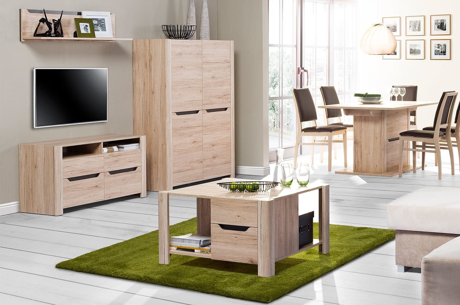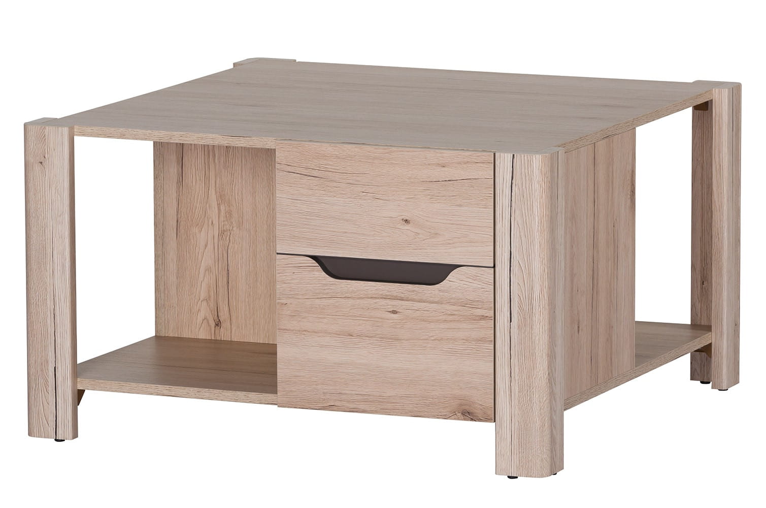 Stolik okolicznościowy z 2 szufladami to funkcjonalna bryła, której nie może zabraknąć w żadnym salonie. Idealnie komponuje się z niskimi meblami wypoczynkowymi, kanapami, fotelami itd. Uniwersalna jasna kolorystyka dębu san remo i brązu uni pozwala na wiele swobodnych aranżacji.