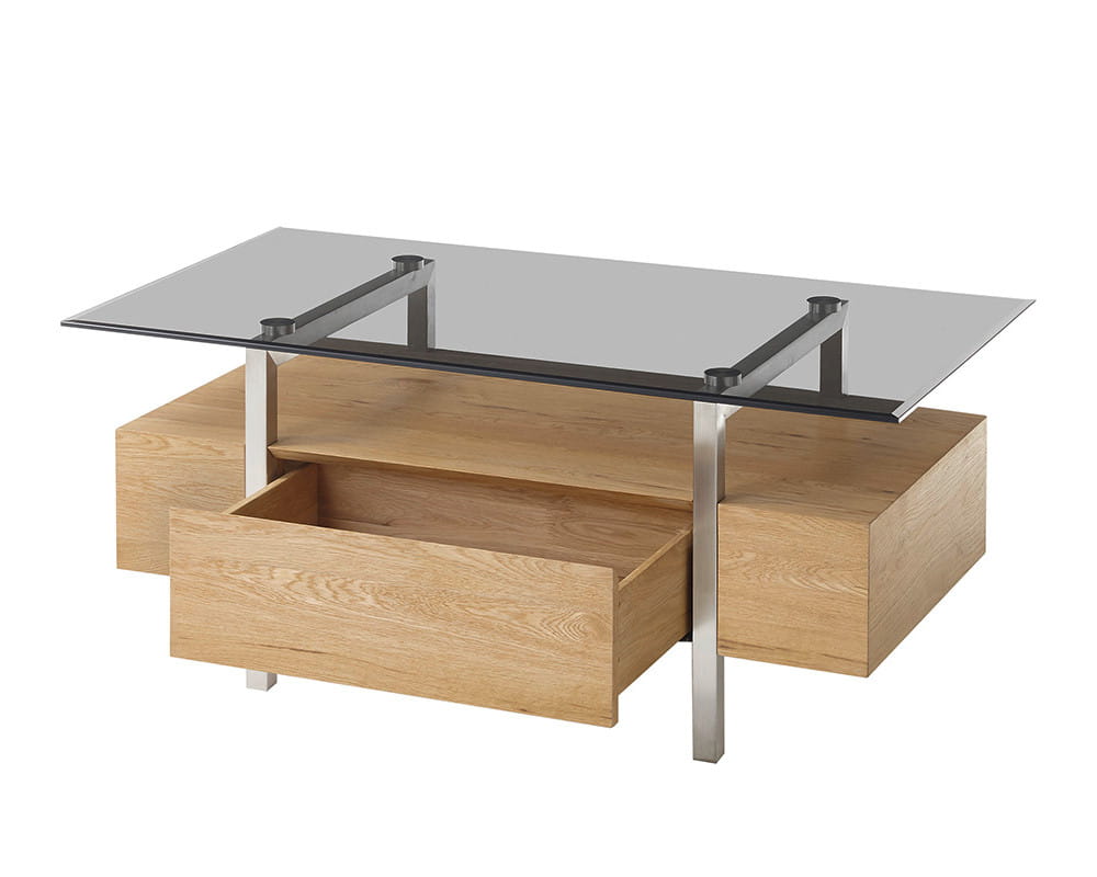 - Wykończenie blatu: szkło szare, okleina dębowa olejowana