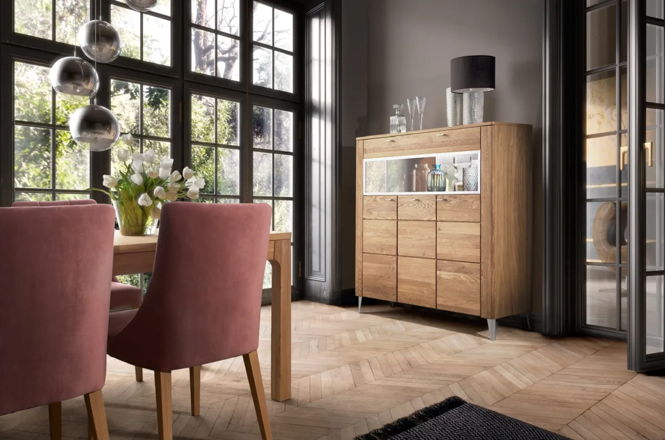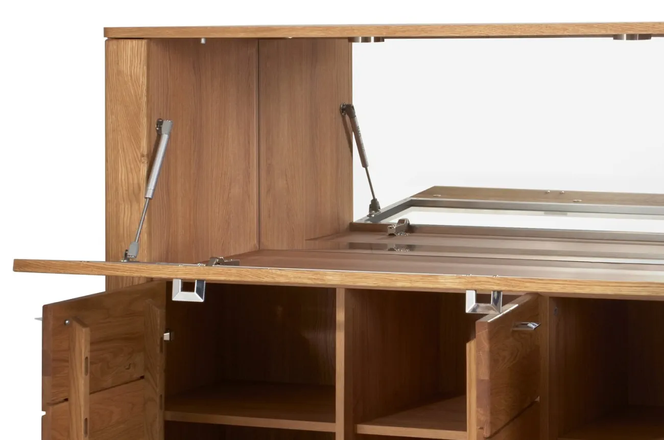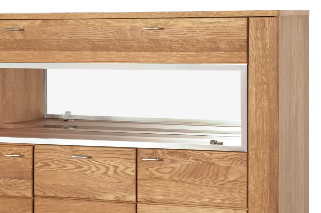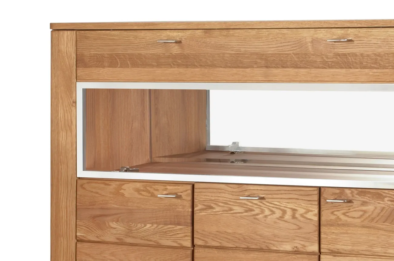 - Wykonanie front: lite drewno dębowe szczotkowane, szkło hartowane - bezbarwne