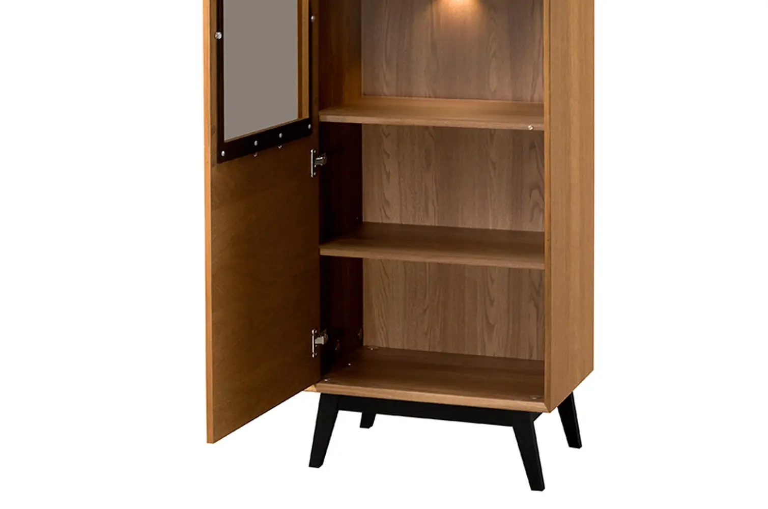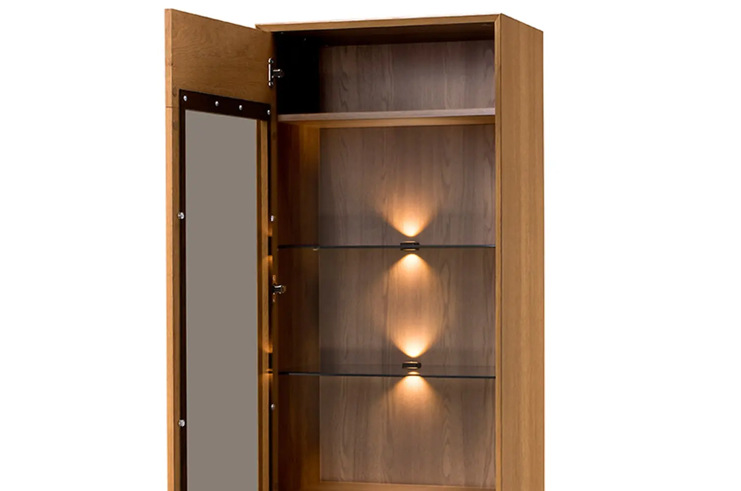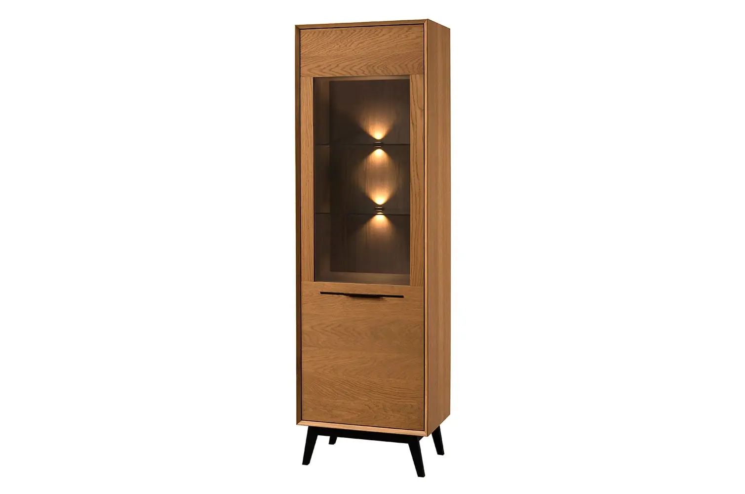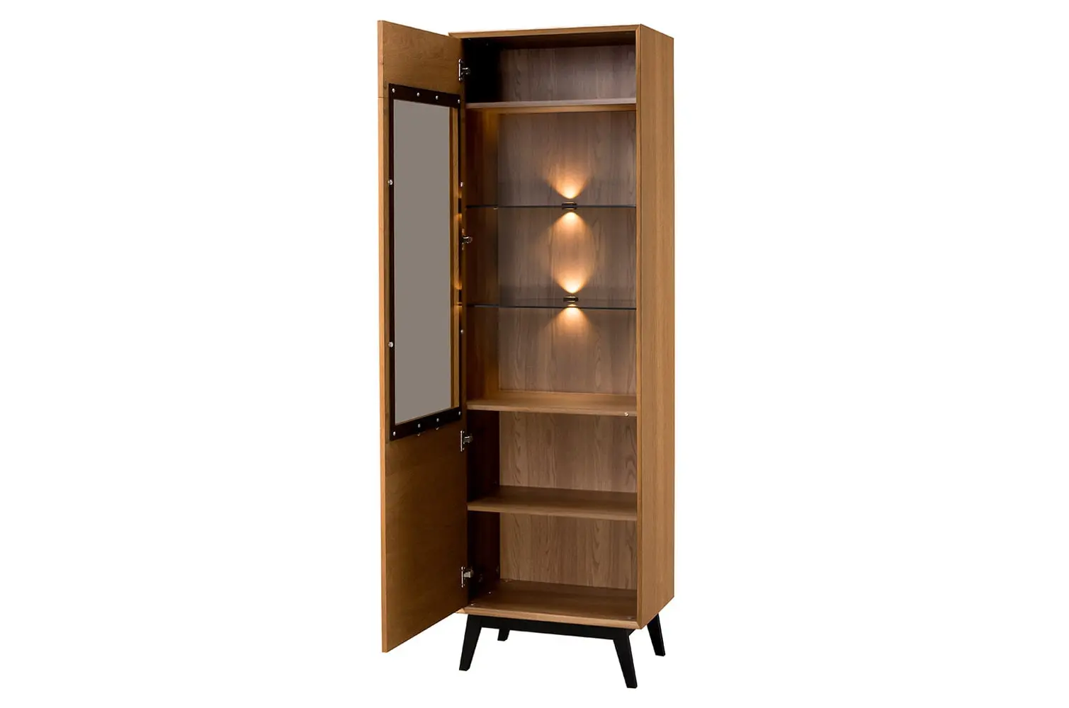 Wykonana z naturalnej okleiny dębowej w kolorze dąb rustical karmelowy, witryna zachwyca przeszkleniem drzwiczek oraz 6 półkami, które doskonale eksponują przechowywane przedmioty. W standardzie znajduje się ciepłe oświetlenie LED, które podkreśla ich estetykę.