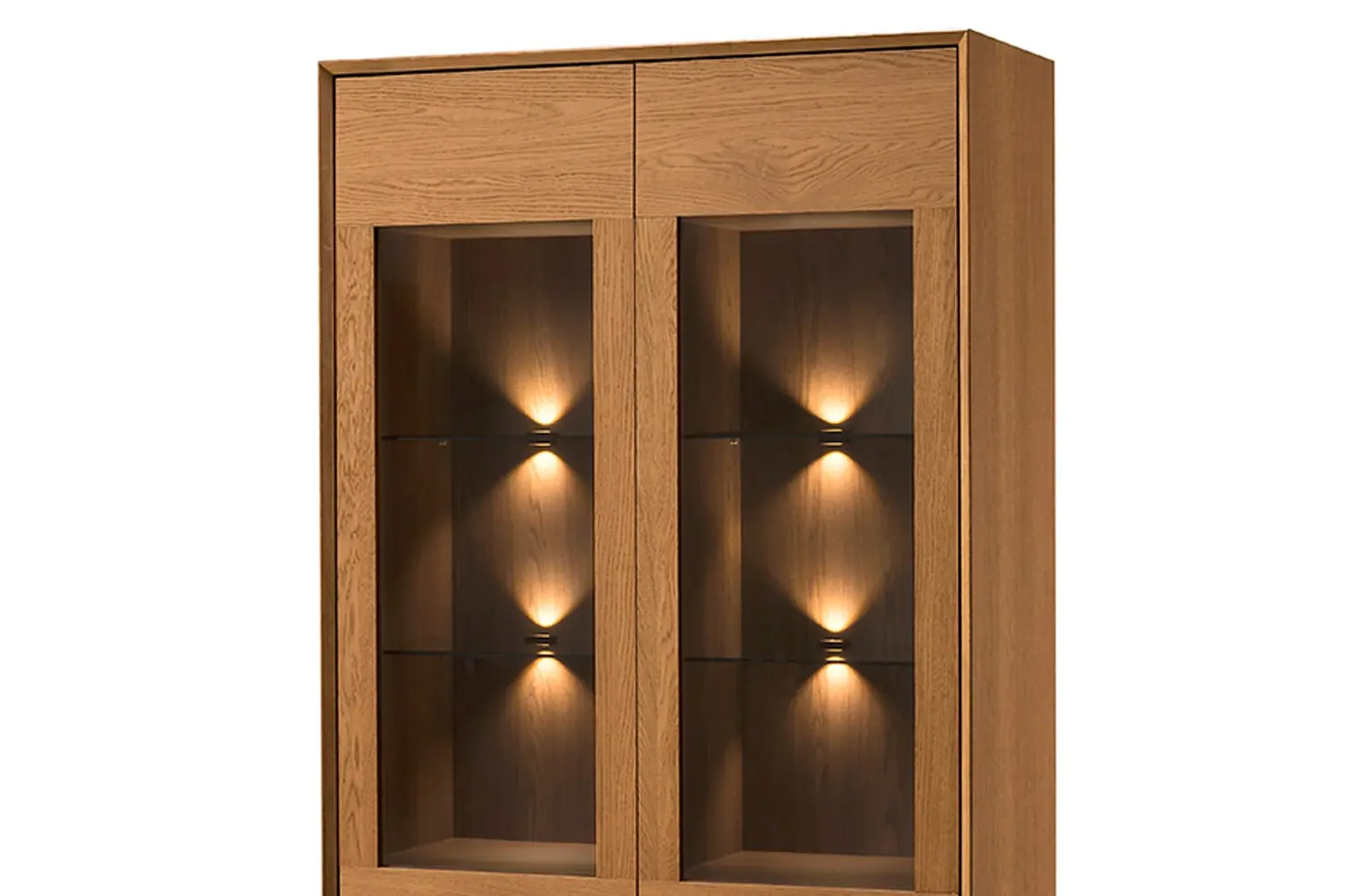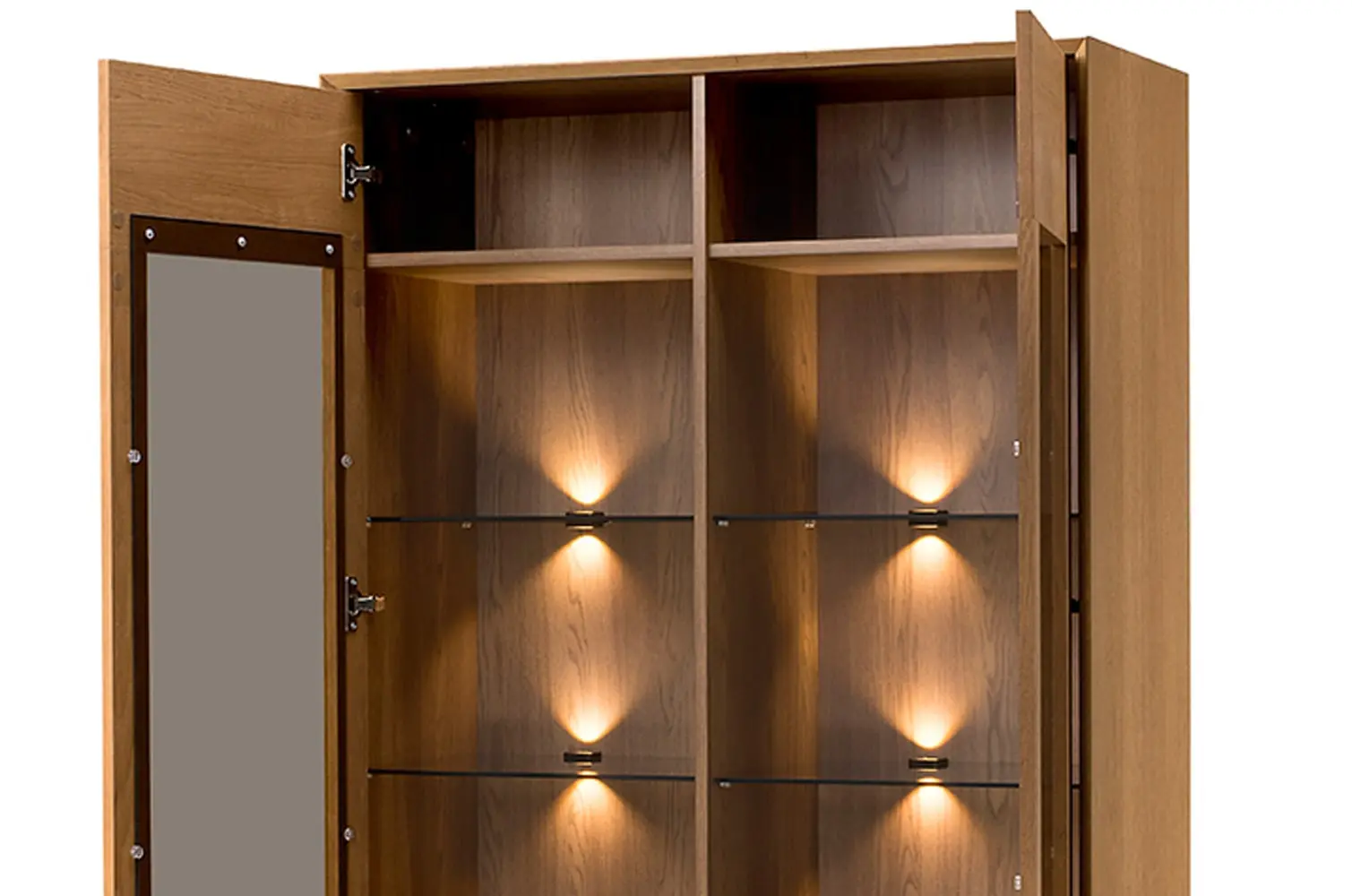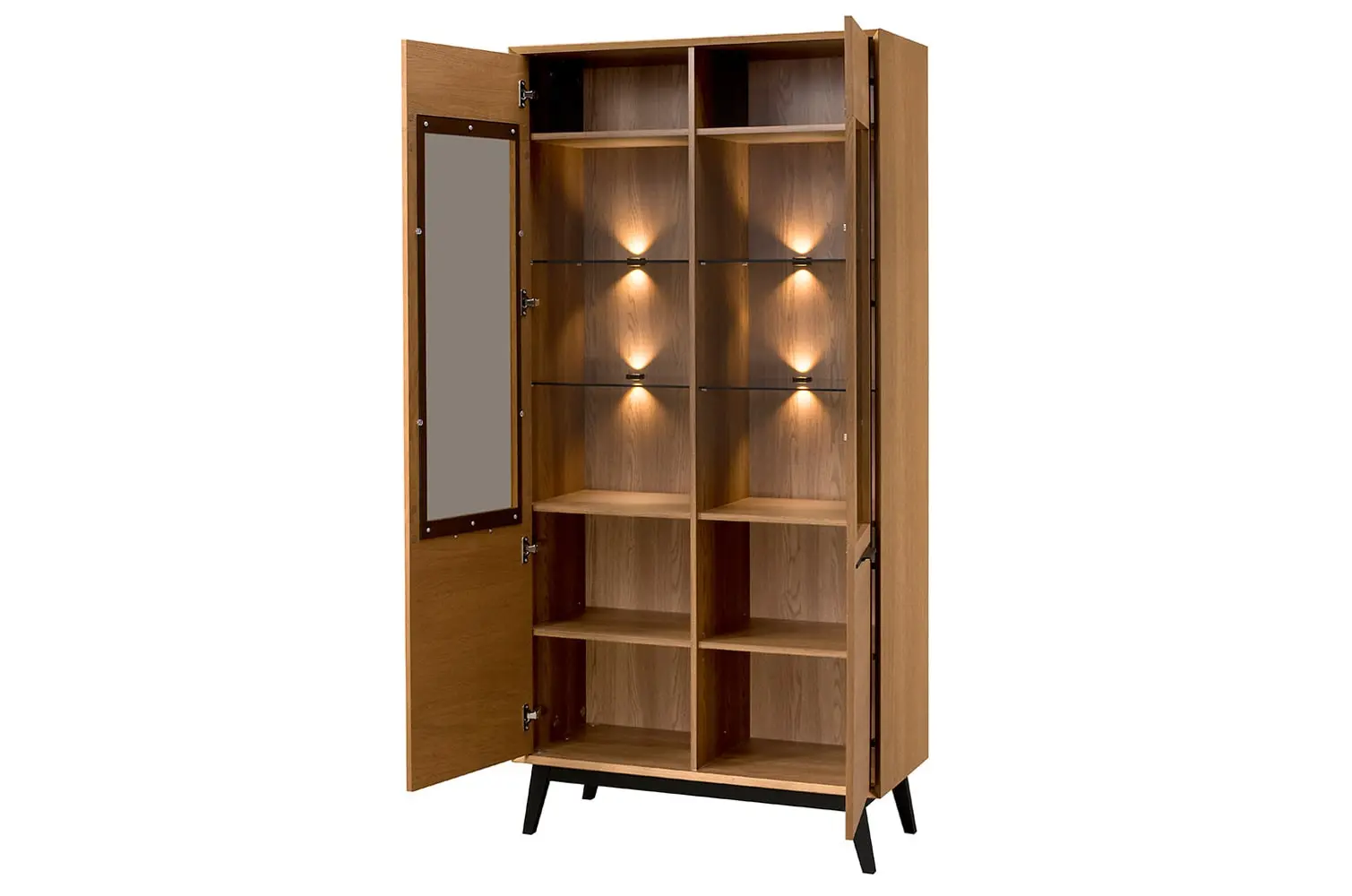 Witryna posiada dwa przeszklenia z hartowanego szkła oraz 12 półek, które doskonale eksponują przechowywane przedmioty. Oświetlenie LED w ciepłej barwie w standardzie dodaje uroku i podkreśla estetykę wnętrza.
