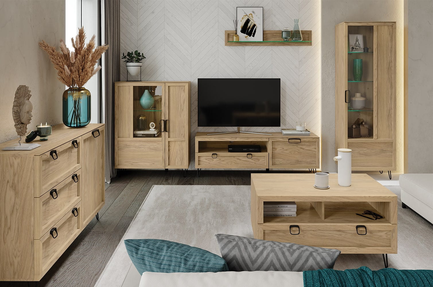 - Wykonanie korpus: zew. płyta meblowa w naturalnej okleinie dębowej; wew. płyta meblowa foliowana