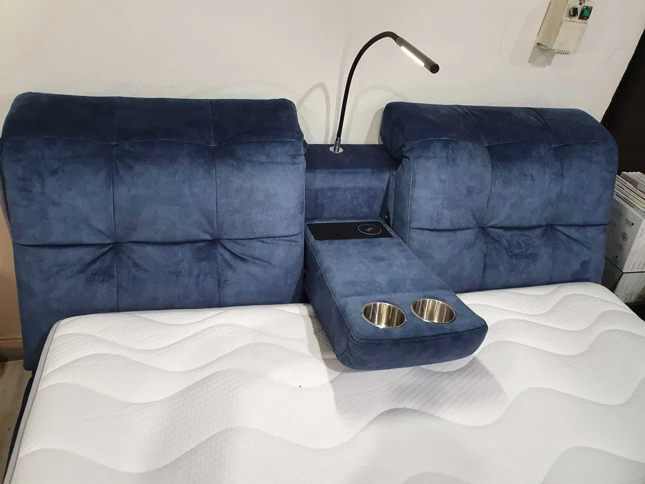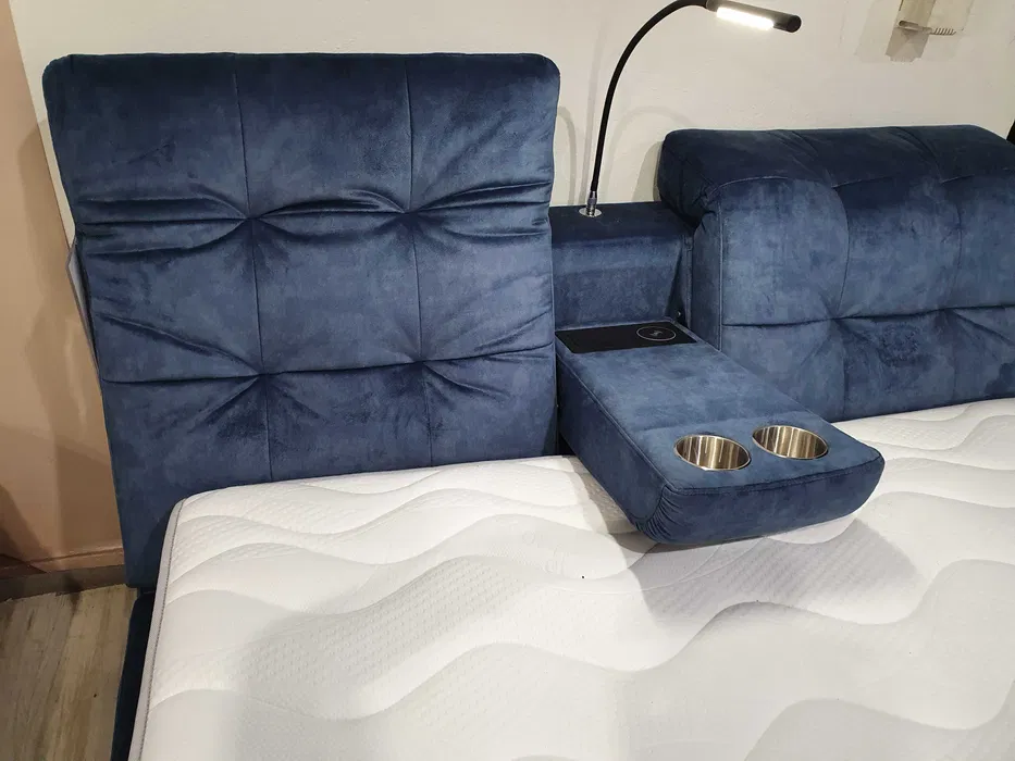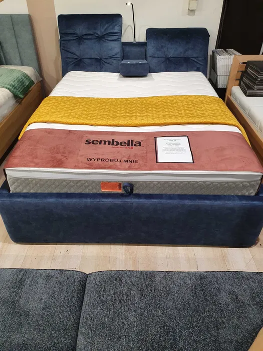 Nowoczesne łóżko z rozbudowanym wezgłowiem, oferującym wiele możliwości użytkowych. Wezgłowie to dwie ukośne, miękko tapicerowane poduchy, które rozdziela chowany boks – element bogato wyposażony w techniczne udogodnienia. Model do przestronnych sypialni (szer. materaca 1,6 i 1,8 m); stosunkowo duża wysokość skrzyni jest dobrze usprawiedliwiona: kryje się w niej pojemnik na pościel.