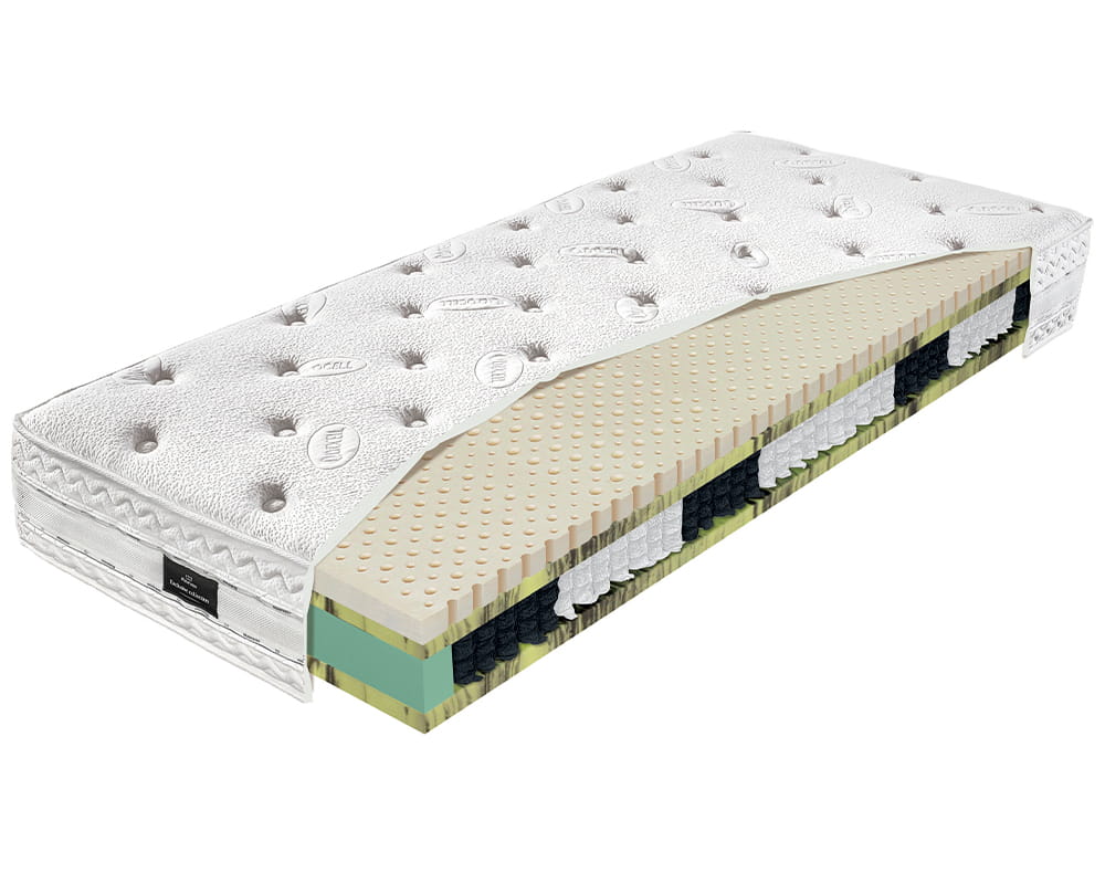 Materac Hybrid Herbal charakteryzuje przemyślane dobranie materiałów. Są to kolejno: przewiewna płyta lateksowa; pianka HERBAL z wyciągiem z rumianku; spreżyny kieszonkowe; pianka HERBAL z wyciągiem z rumianku.