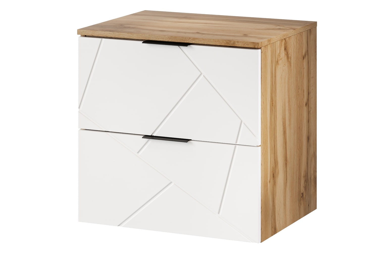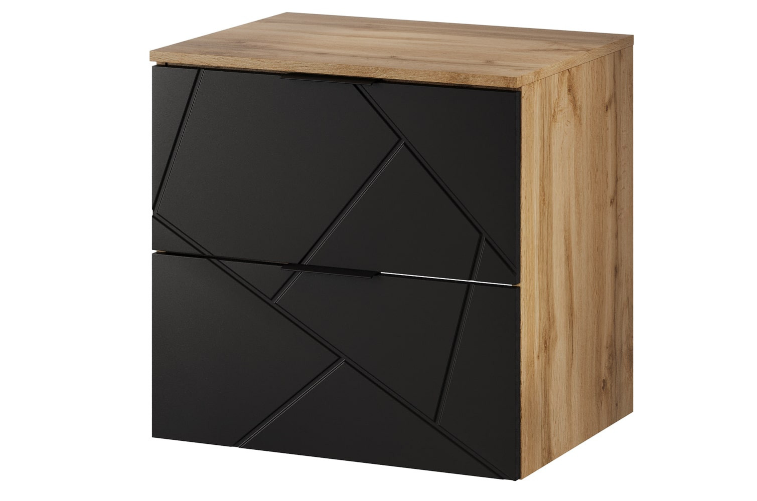 Szafka łazienkowa pod umywalkę Mazi o szerokości 60 cm to nowoczesny mebel wiszący, który łączy funkcjonalność z wyrazistym designem. Charakterystyczny, ryflowany front z geometrycznym wzorem nadaje bryle dekoracyjny akcent, a zestawienie z korpusem w dekorze dąb wotan tworzy spójną i elegancką kompozycję.