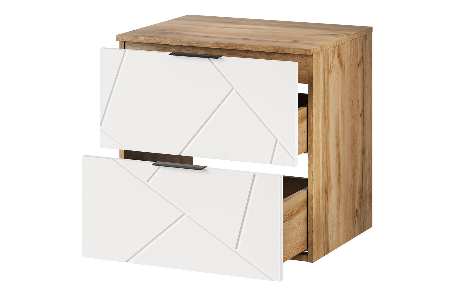Szafka wyposażona jest w szuflady z częściowym wysuwem, które umożliwiają wygodne przechowywanie kosmetyków i akcesoriów łazienkowych, pomagając utrzymać porządek w strefie umywalkowej. Przemyślana konstrukcja pozwala na efektywne wykorzystanie przestrzeni, a dołączone czarne, matowe uchwyty zapewniają wygodne otwieranie i podkreślają nowoczesny charakter mebla.