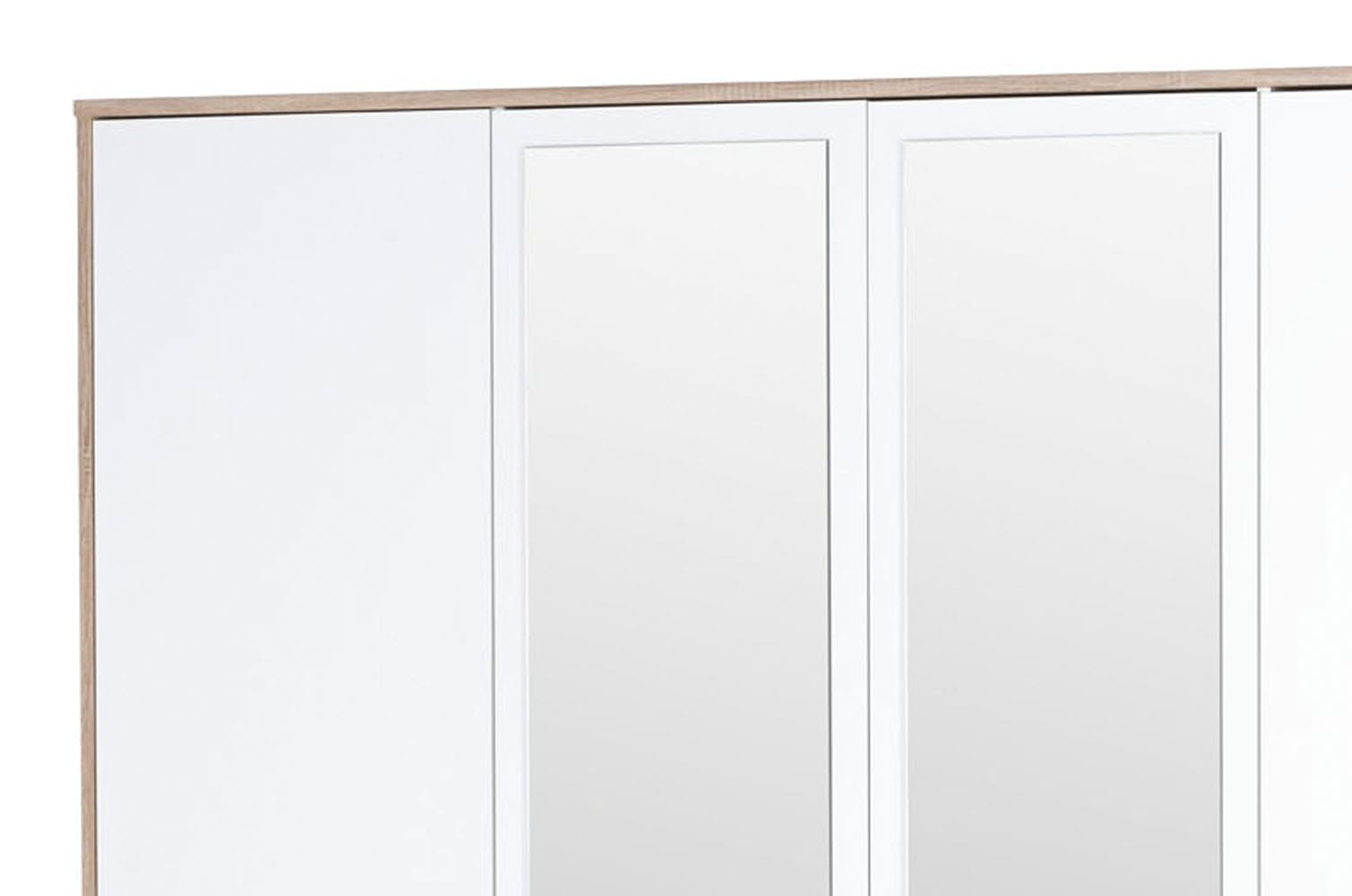 Duża 4-drzwiowa szafa z lustrem wyposażona w funkcjonalne półki i drążki, które pozwolą uporządkować garderobę, oraz 3 głebokie szuflady, które bez problemu pomieszczą bieliznę i akcesoria. Dodatkowym atutem MILO 02 jest bieliźniarka, dzięki której w Twojej szafie na zawsze zapanuje ład i porządek. Linia MILO zachowana jest w jasnej kolorystyce dębu sonoma i bieli, to ponadczasowe połączenie kolorystyczne daje możliwość dowolnych aranżacji i połączeń z jasnymi lub ciemnymi kolorami ścian.