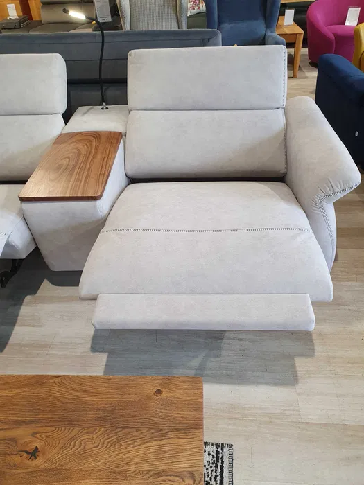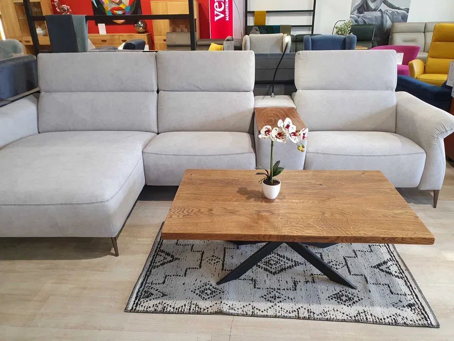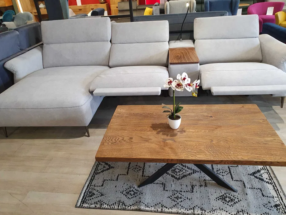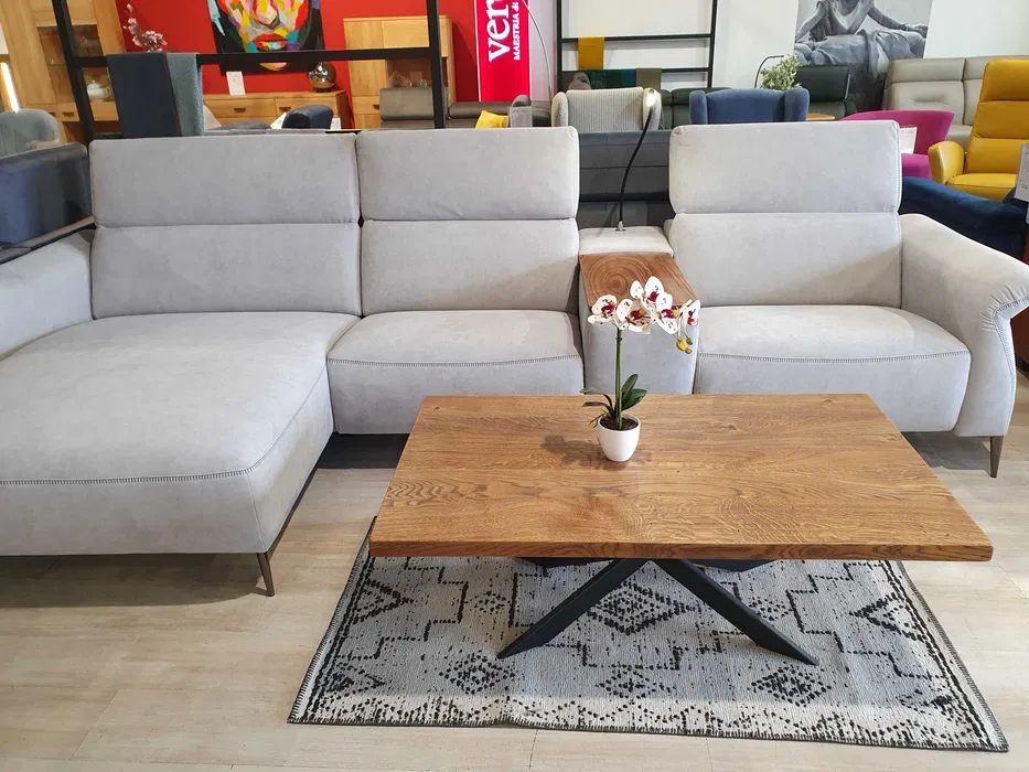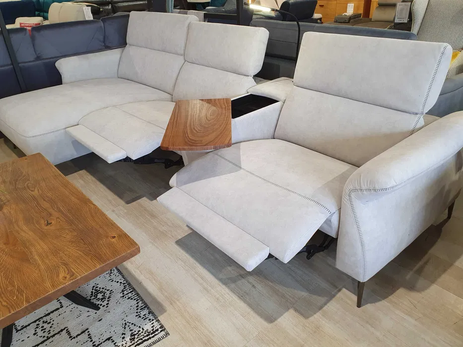 Nowoczesny zestaw wypoczynkowy: elementy modułowe pozwalające na dowolną konfigurację narożników. Wybitnie wygodny – oparcia i siedziska są tu masywne, obficie wypełnione; do dyspozycji są też: szezlong, podnoszone zagłówki, funkcje relaks. Dosłownie pod ręką jest schowek z uchylanym blatem, mieszczący bogate wyposażenie dodatkowe, m. in. lampkę, ładowarkę, gniazda USB.