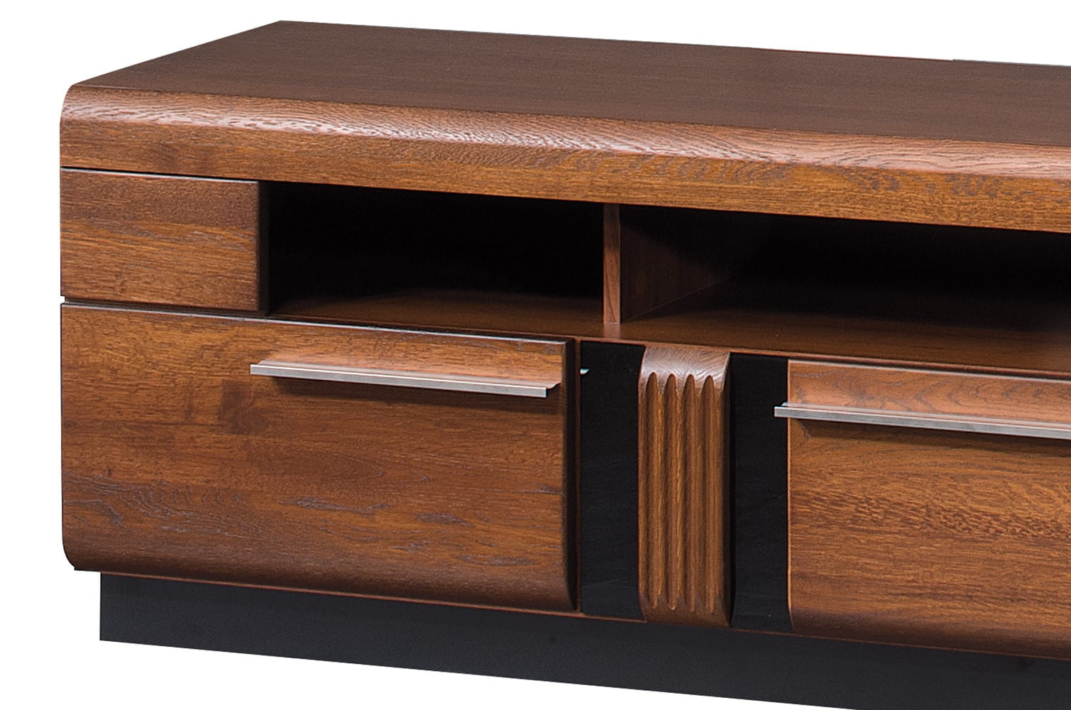 Szafka RTV to niezbędne wyposażenie każdego salonu. Kino domowe nierzadko stanowi centralne miejsce w domu, wokół którego gromadzi się cała rodzina, dlatego ważne jest, żeby mebel doskonale komponował się ze stylistyką pomieszczenia. Dzięki funkcjonalnemu projektowi bez trudu uda się ukryć nieatrakcyjnie wizualnie elementy sprzętu rtv, a pojemne szuflady pomieszczą niezbędne akcesoria. Wnęka na sprzęt multimedialny posiada otwory na kable. Za sprawą atrakcyjnej prezencji zestawionej z użyteczną formą, szafka Porti to doskonała propozycja dla osób, które cenią nowoczesne i praktyczne rozwiązania. Front został wykonany z litego drewna, dzięki czemu całość prezentuje się elegancko i nowocześnie. Klasyczne połączenie głębokiej czerni z kolorem „dębu antycznego” świetnie sprawdzi się w każdej aranżacji.