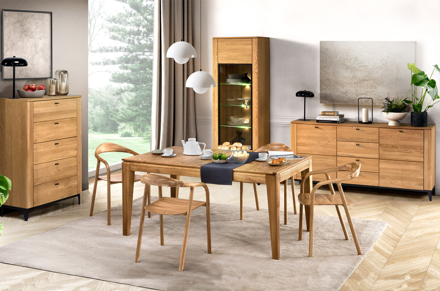 - Wykonanie korpus: zew.: płyta meblowa w naturalnej okleinie dębowej, wew.: płyta meblowa foliowana w dekorze drewnopodobnym