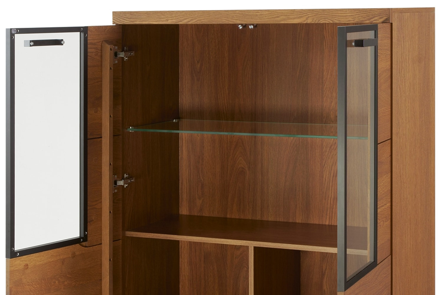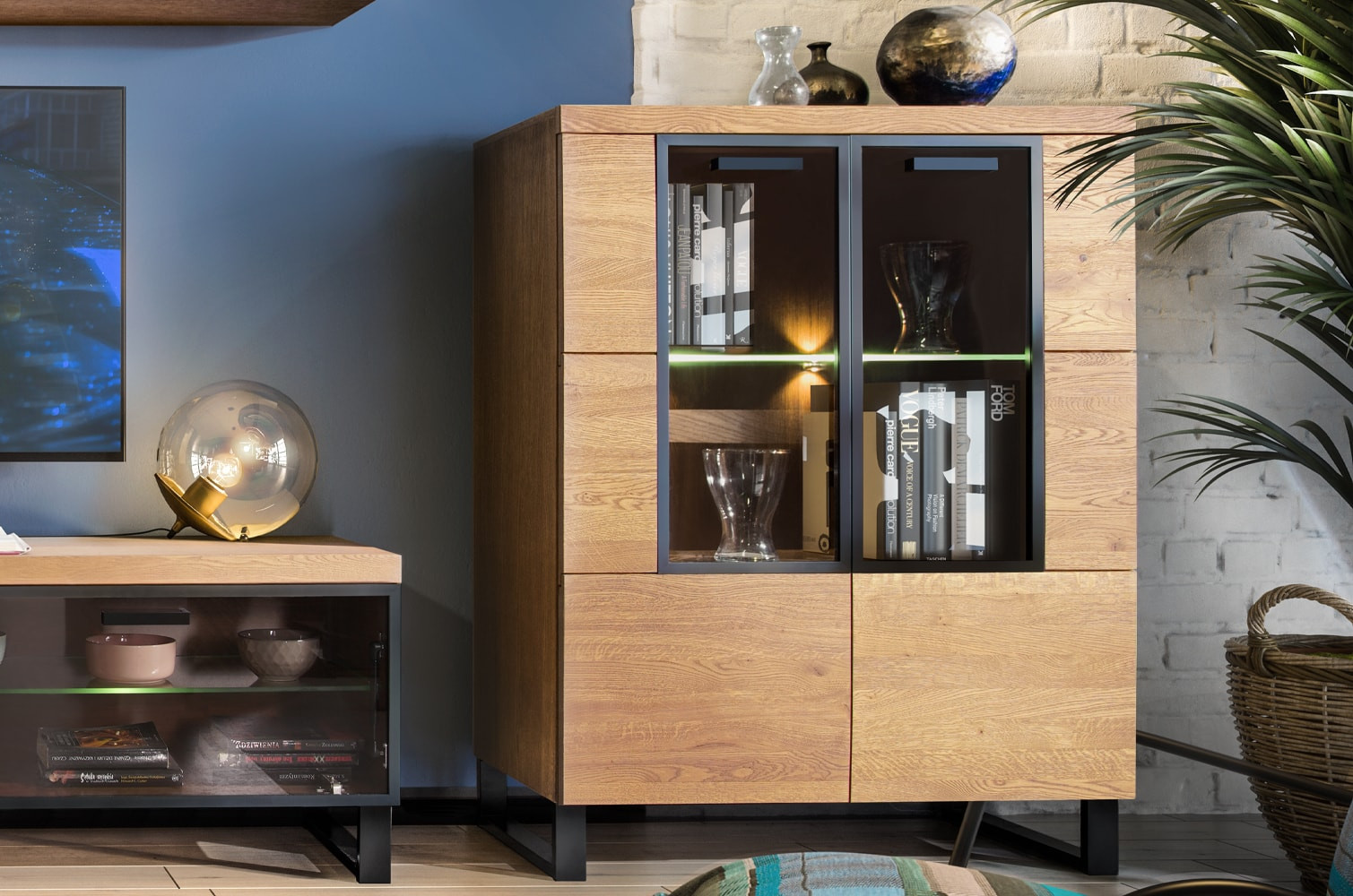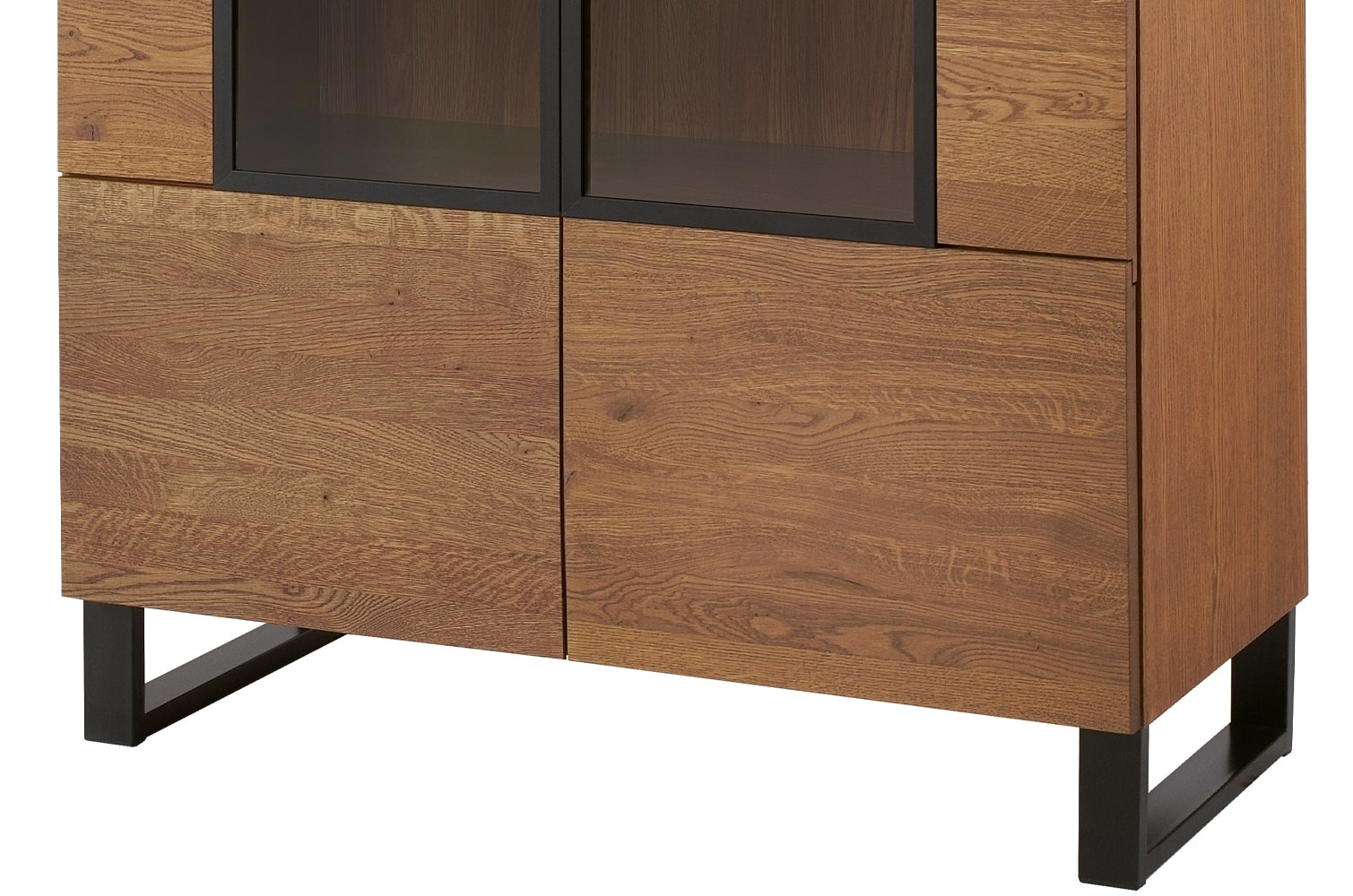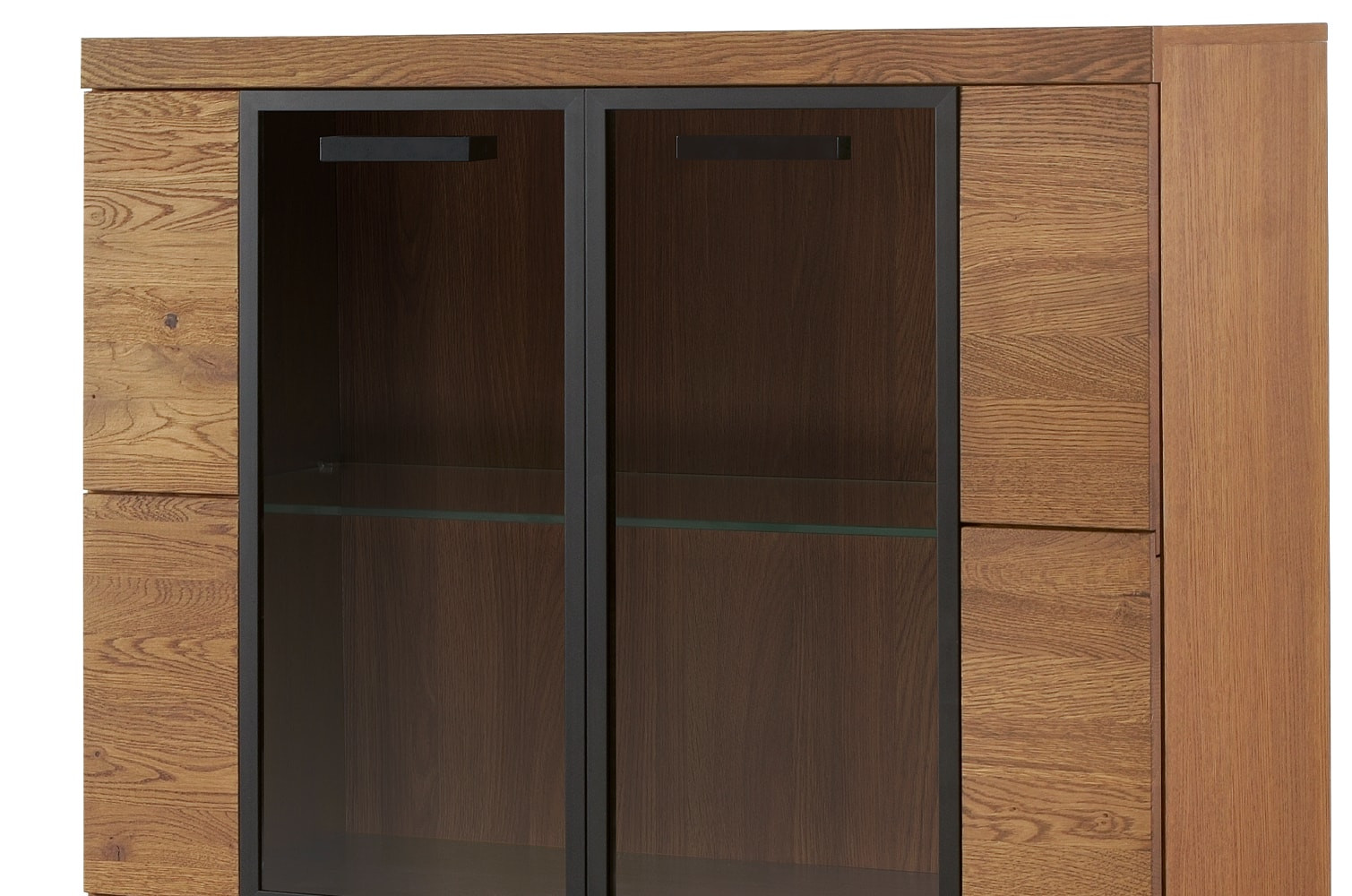 - Wykonanie front: lite drewno głęboko szczotkowane, szkło hartowane