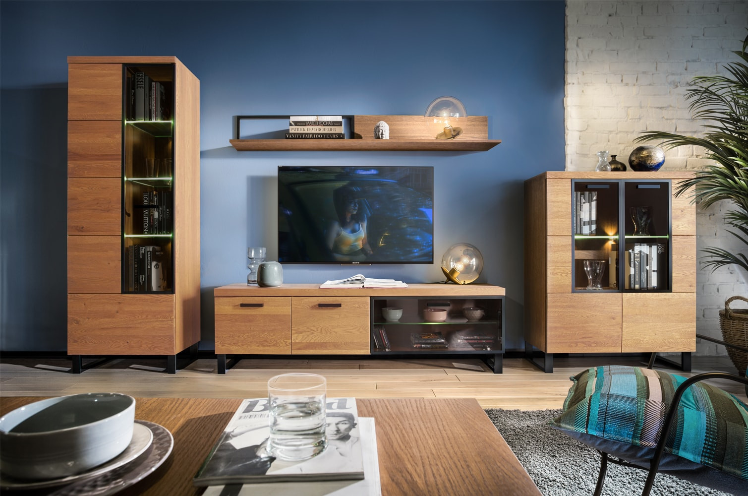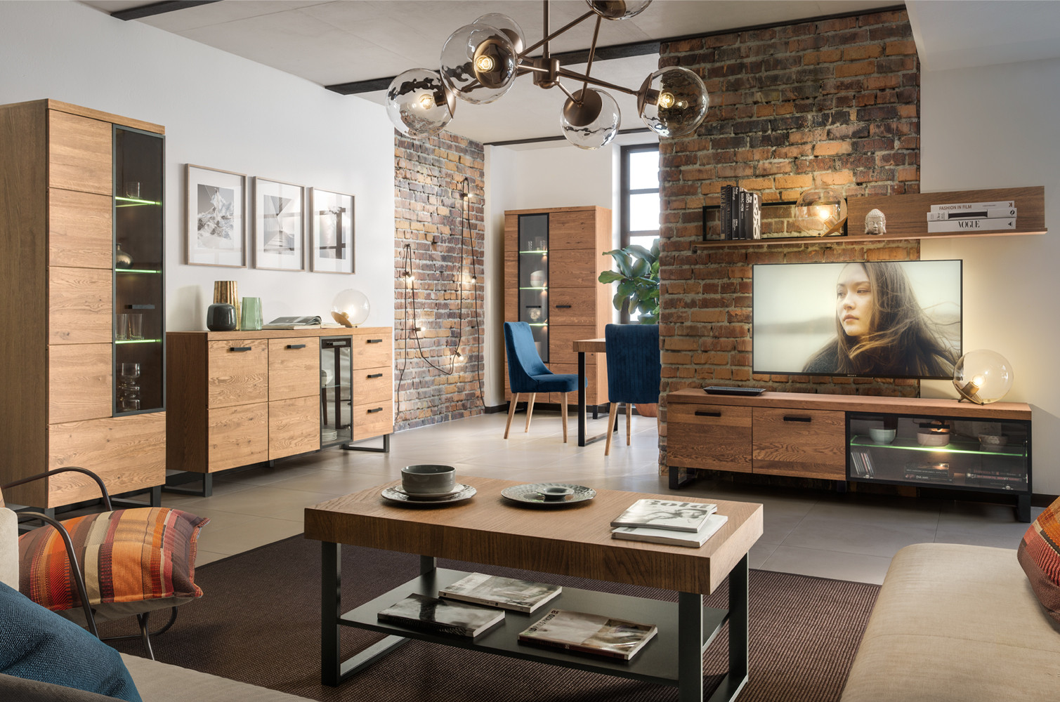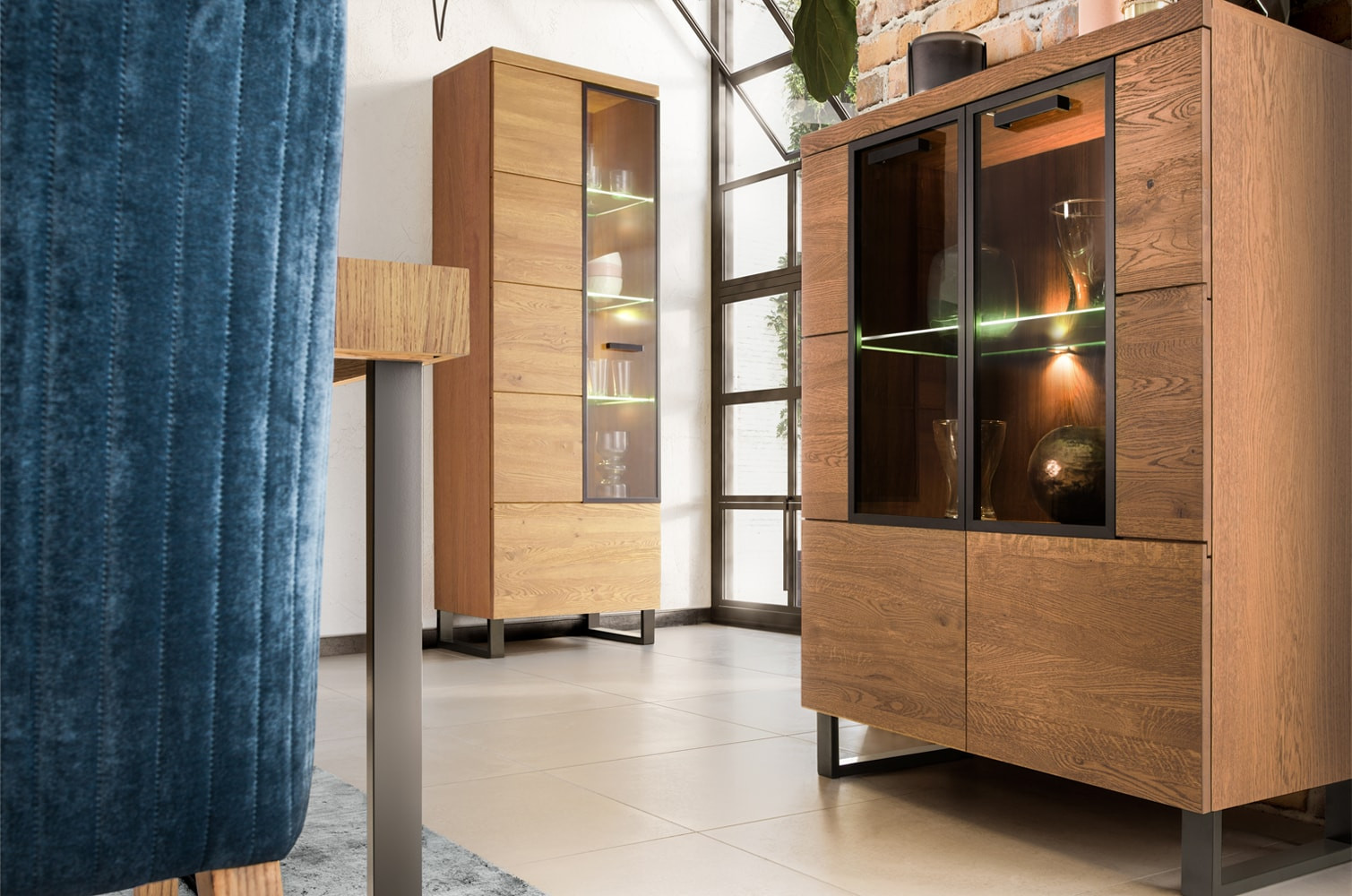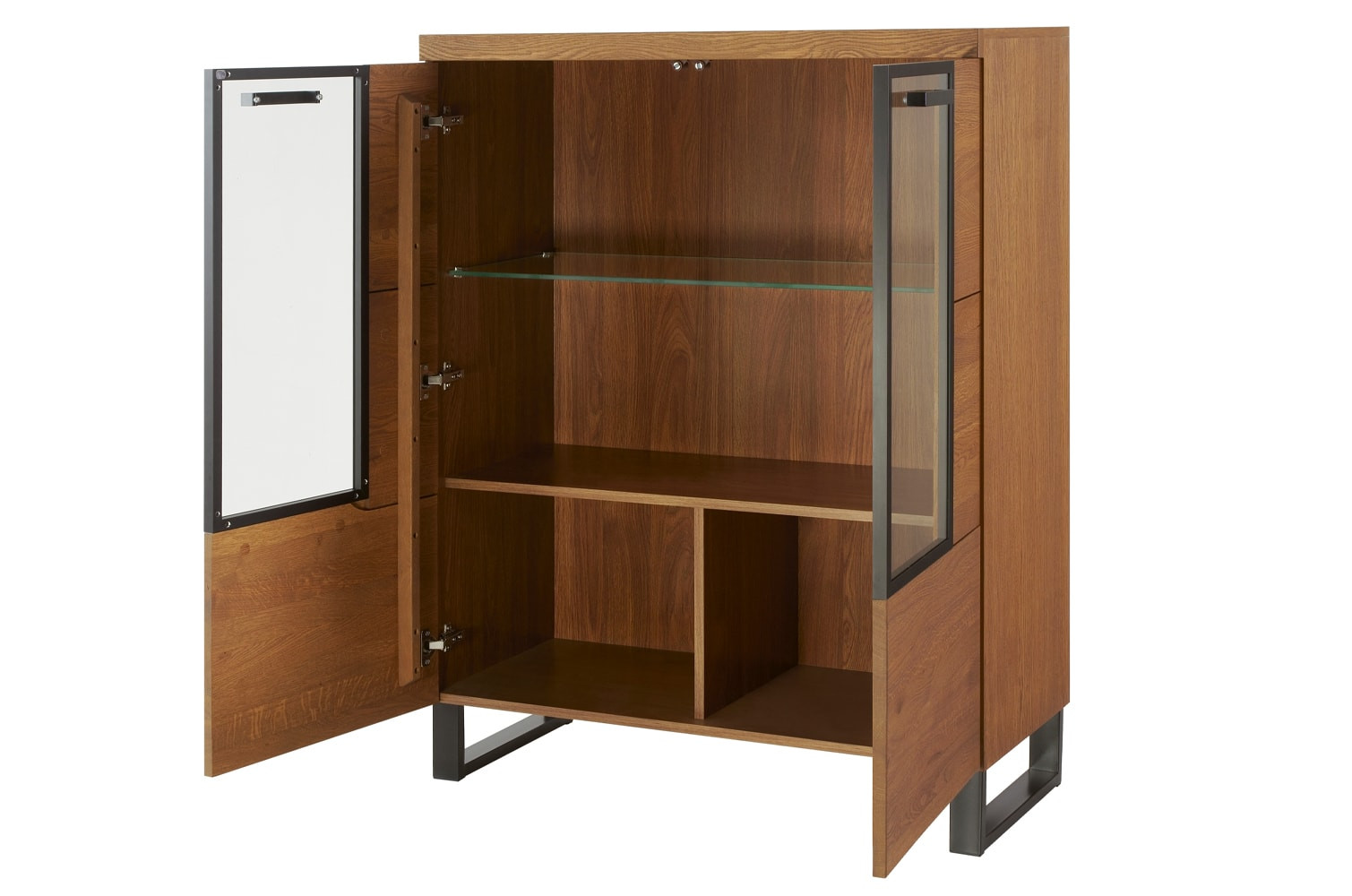 - Wykonanie front: lite drewno głęboko szczotkowane, szkło hartowane