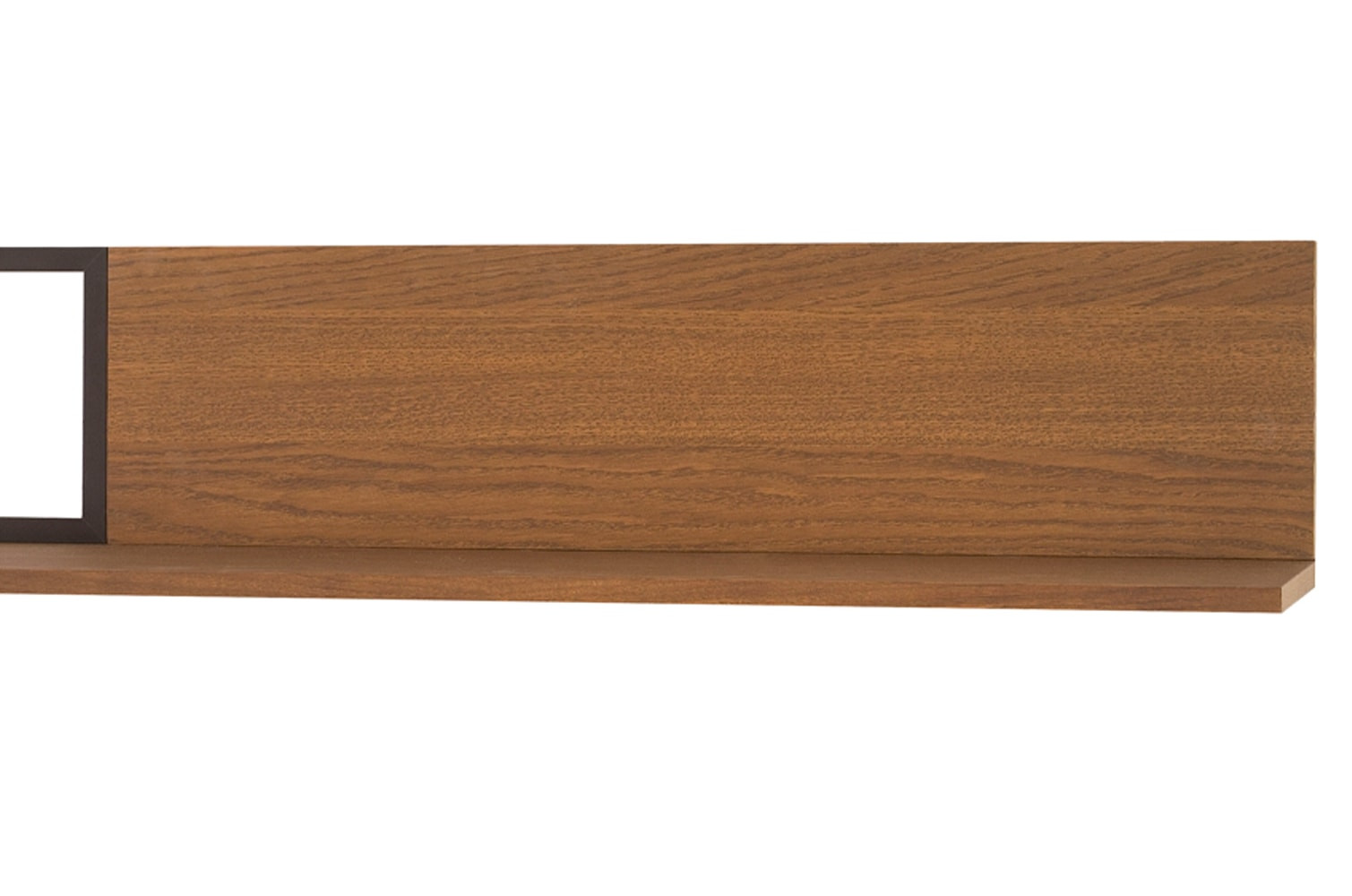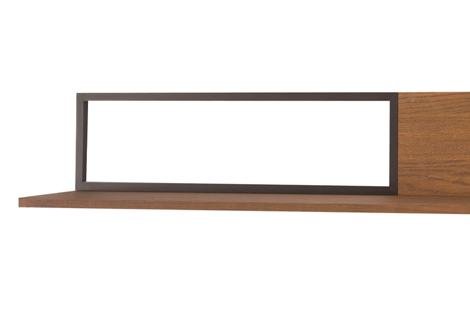 Korpus wykonany z płyty meblowej w naturalnej okleinie zapewnia trwałość i estetyczne wykończenie, natomiast aluminiowa ramka podkreśla linię mebla i wzmacnia jego konstrukcję. Minimalistyczny design ułatwia integrację półki z innymi elementami wyposażenia.