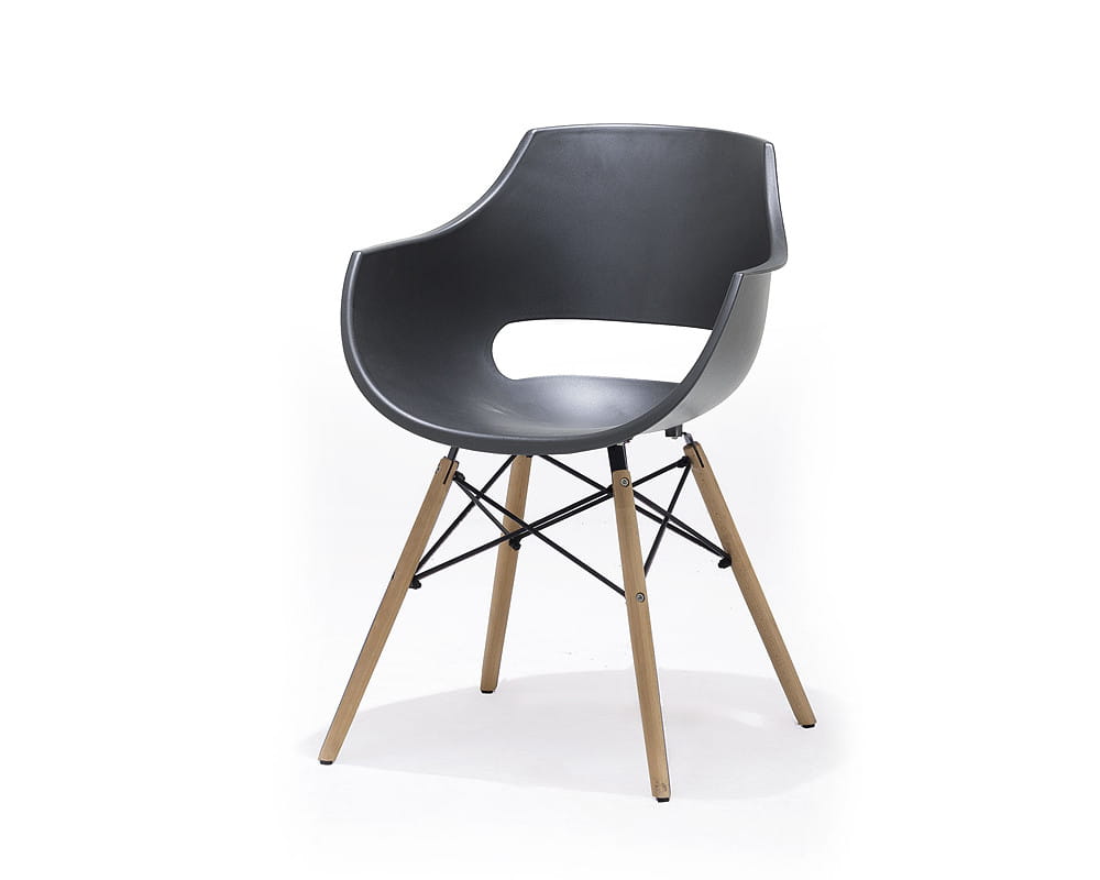 Prezentowany model z pierwszej miniatury to krzesło w kolorze szarym z drewnianymi nogami, wykończonymi lakierem w kolorze naturalnym.