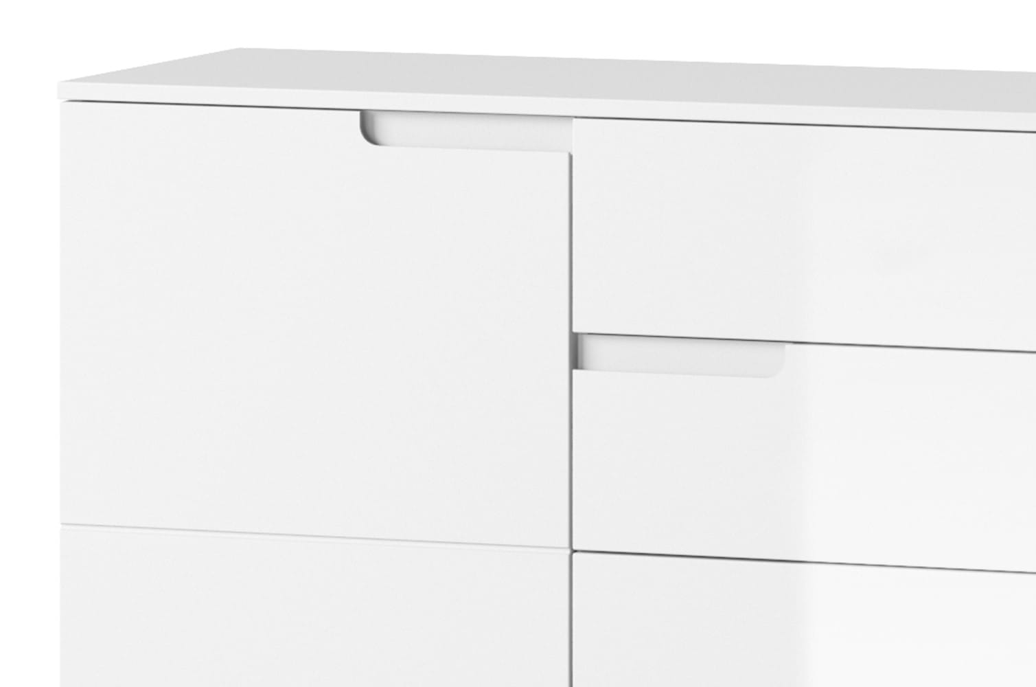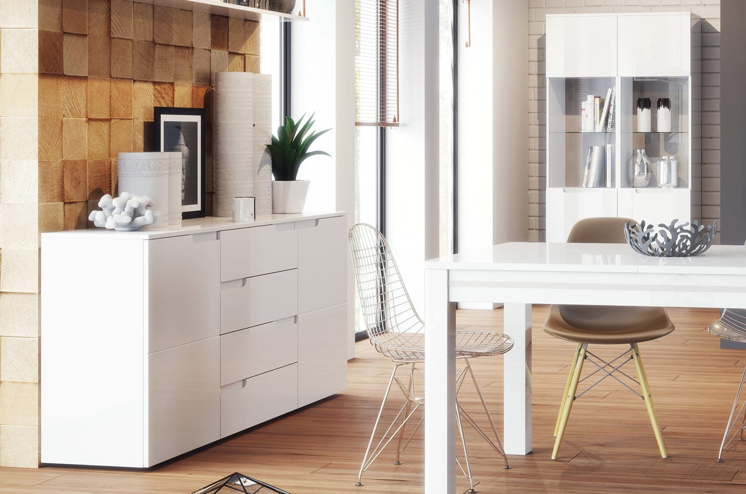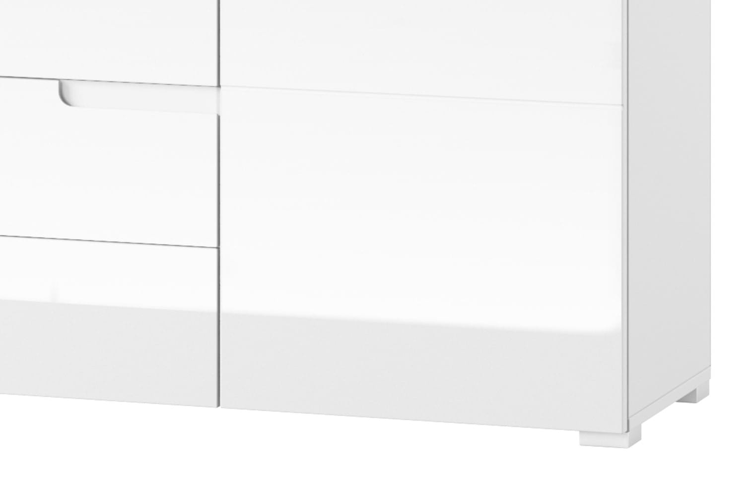 Komoda dwudrzwiowa z czterema szufladami z kolekcji Selene to projekt będący ucieleśnieniem najnowszych trendów w dziedzinie aranżacji wnętrz. Nowoczesna, geometryczna forma zestawiona z bielą podkreśloną wysokim połyskiem sprawia, że projekt prezentuje się nienagannie i interesująco. Zastosowanie najwyższej jakości materiałów i precyzyjne wykonanie jest gwarancją trwałości i odporności na zniszczenia. Kolekcja Selene to ponadczasowe rozwiązania dla osób ceniących elegancję, nowoczesny styl i przestronność. Komoda z tej linii to funkcjonalny projekt zapewniający dużo miejsca do przechowywania – przestronne półki i pojemne szuflady pomieszczą wszystkie niezbędne rzeczy i akcesoria.