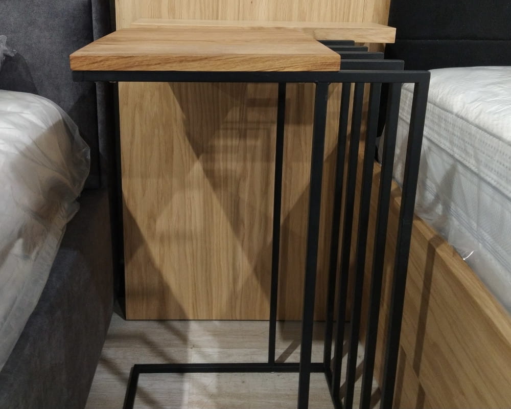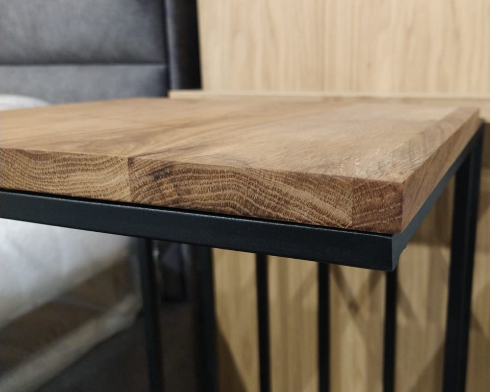 - Wykończenie: blat z drewna dębowego (olejowane) + metalowy stelaż malowany proszkowo (czarny mat)
