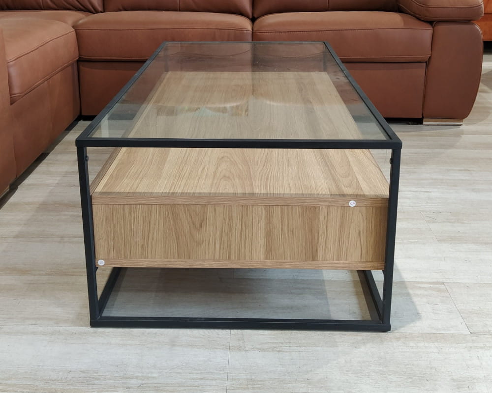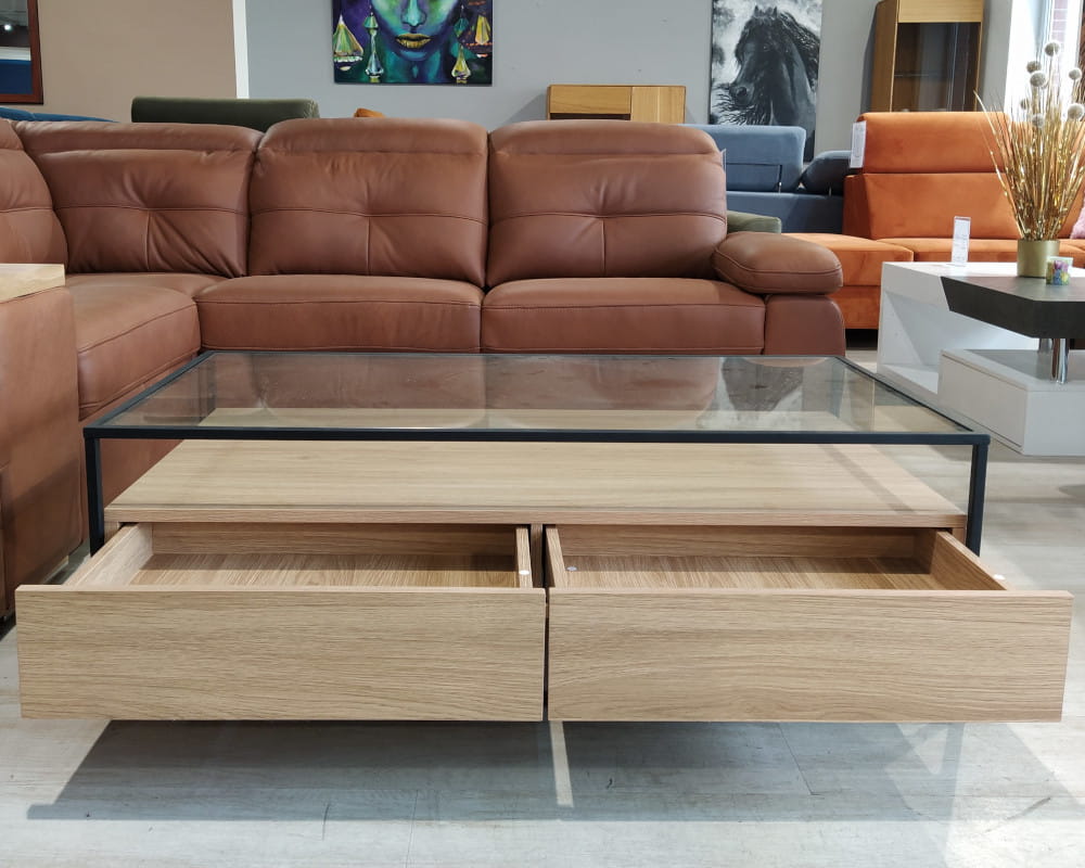 - Wykończenie: laminat dąb + czarny stelaż (malowany proszkowo) + blat szklany bezbarwny