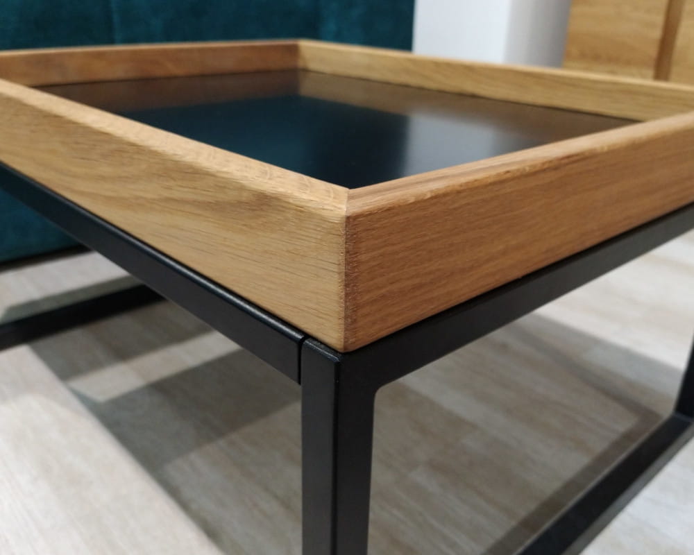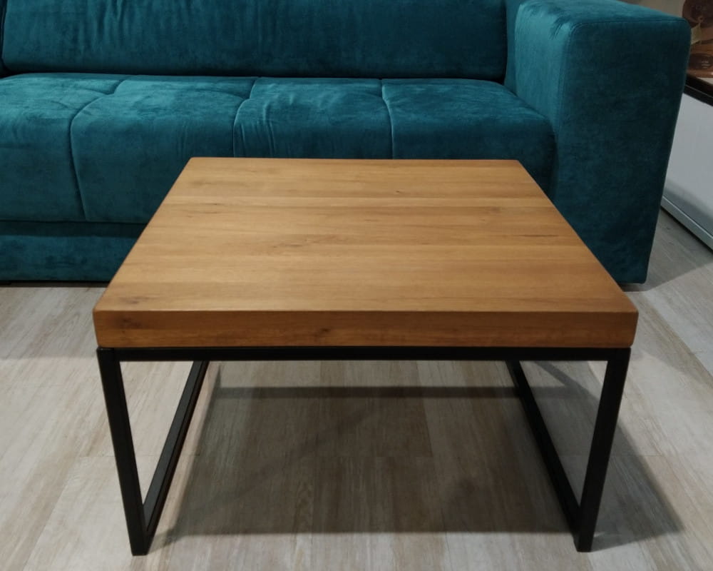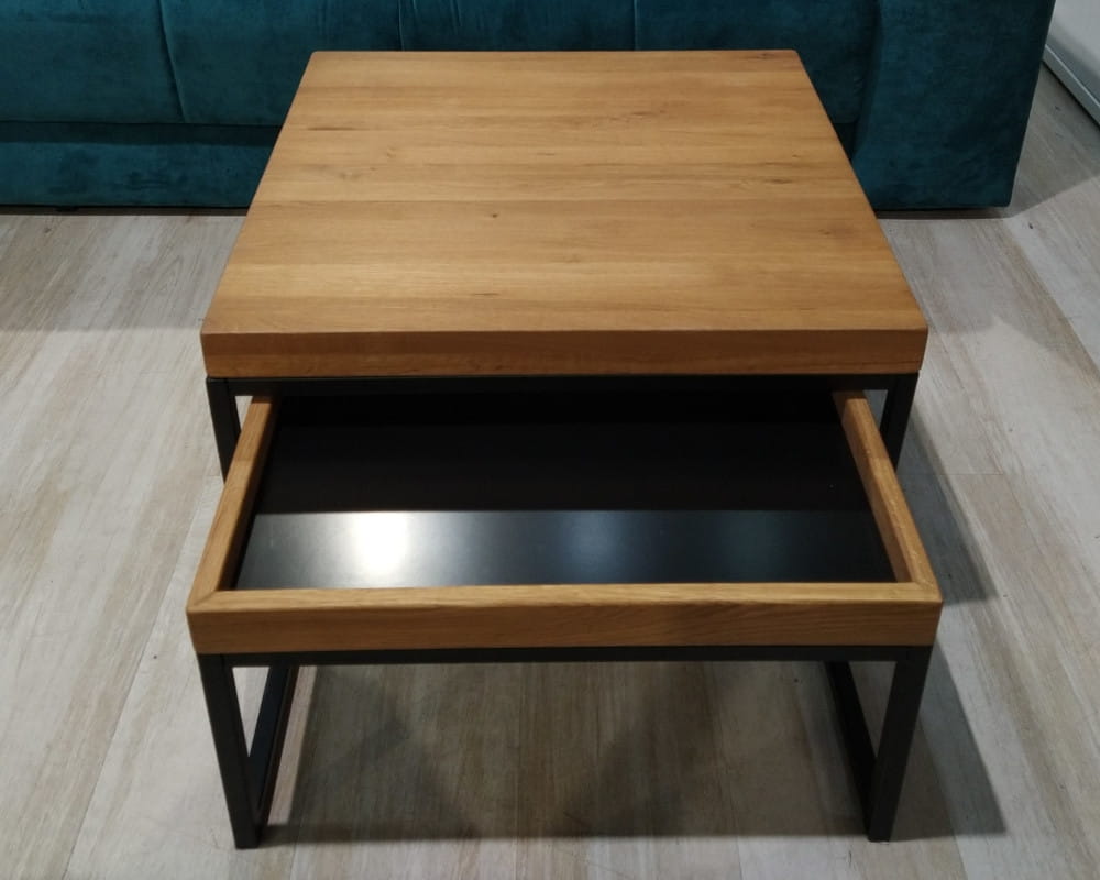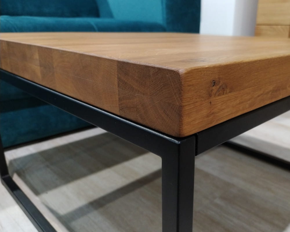 - Wykończenie: blat drewno sękate (olejowane) + metalowy stelaż (czarny)
