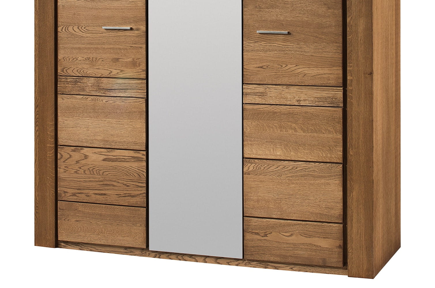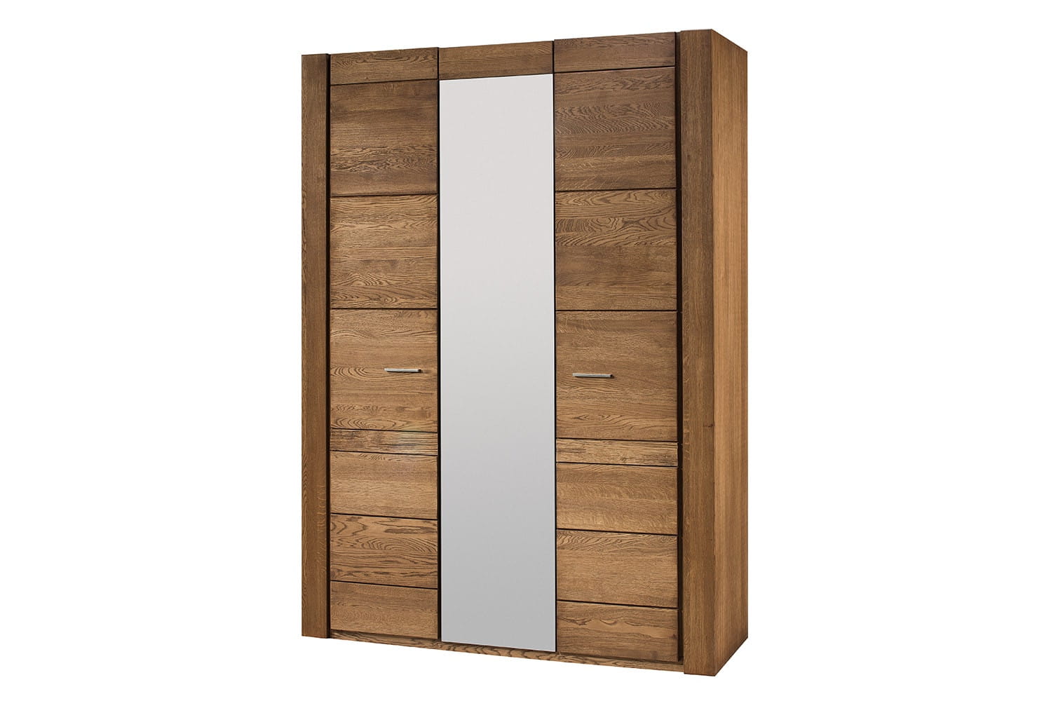 Szafa 3-drzwiowa z kolekcji Velvet to mebel, który pozwoli zaprowadzić porządek w każdym wnętrzu. Precyzyjne wykonanie, wysoka jakość użytych materiałów i elegancki design sprawiają, że projekt spełni nawet najbardziej wygórowane oczekiwania. Metalowe uchwyty podkreślają naturalne piękno litego dębu, co potęguje prestiżowy charakter szafy. W jej wnętrzu umieszczono drążek ubraniowy i półki, dzięki czemu bez trudu uda się posegregować wszystkie elementy garderoby. Lustro umieszczone na froncie jest nie tylko użytecznym uzupełnieniem projektu, ale również elementem, który optycznie powiększyć wnętrze.